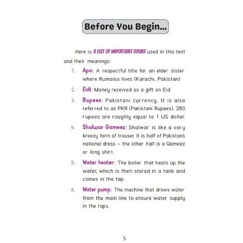 Nine-year-old Rumaisa Haris moves with her family to her grandparents’ ancestral house—a place where cats keep their kittens hidden under the bathtub, the curtain rod wobbles dangerously if hit too hard with a broom to scare away lizards, and worst of all, the hot water supply gets cut off in the middle of winter. Since her mother’s budget can only accommodate a few repairs at a time, Rumaisa devises a clever plan to raise money.