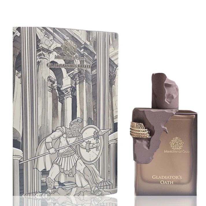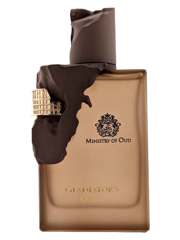 Gladiator's Oath by Ministry of Oud is characterized by an opulent and bold composition. The fragrance opens with spicy notes of saffron and cardamom, followed by a floral heart of lily of the valley, ylang-ylang, and jasmine. The base features a blend of vanilla, caramel, amber, and sandalwood, creating a warm and luxurious finish.