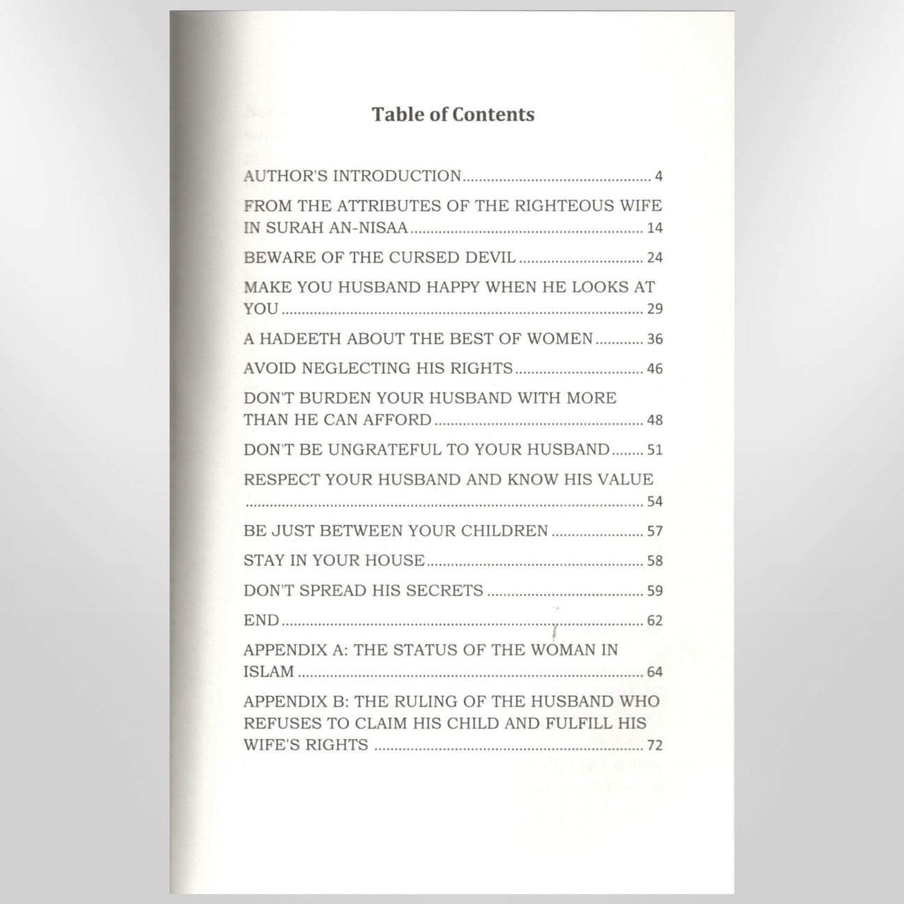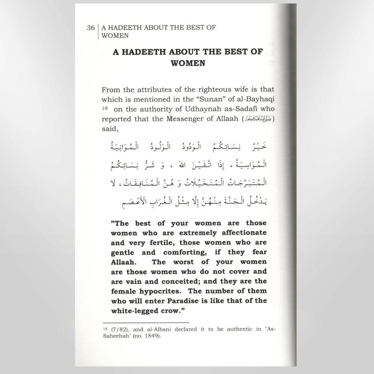 The author says, "The topic of this book, "The Attributes of the Righteous Wife", isn't just for the young woman looking forward to marriage and wants to know about the attributes of a good wife in order to adorn herself with those attributes and prepare herself to implement and perfect them. Nor is it merely addressed to the married woman who has already chosen these righteous attributes and wishes to persevere and continue to practice them. Nor is it only for the married woman who fails to fulfil these attributes and falls short in them in order for her to fix herself and rectify her marital life. Rather it is an address and a reminder much more general than all of this. It is a reminder for the father who wants his daughters as well as any other women under his guardianship to have a good upbringing, an honourable life and an entrance into marital life according to what Allah and His Messenger have intended. This treatise will hopefully aid him in reminding these young women of the legislative guidelines and necessary characteristics that the young Muslim woman must be cultivated upon and look after. This treatise is also a reminder for the mother who is the shepherd of her home, the one responsible for her daughters as their instructor, for surely most women grow up practising that which they saw and heard their mothers doing. It is also a reminder for the callers to Allah to look after this affair, to place importance on this matter and to strive very hard in spreading these virtuous attributes, commendable characteristics and blessed traits...."