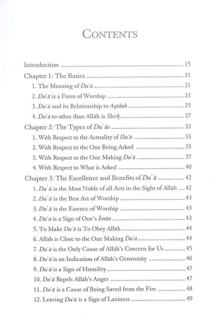 This reading is essential. In this work, the author elaborates on the status, importance, and etiquette of dua' in Islam. In the most comprehensive work yet to be written in English on the topic, the author discusses, among other matters: the excellence and benefits of du'a the types of du'a the pre-conditions that are needed in order for a du'a to be accepted the recommended etiquette of performing du'a the timings and situations in which a du'a is more likely to be answered the various factors that aid or prevent a du'a from being accepted the relationship of du'a with the Divine Decree (qadr) the wisdom behind a delayed response and many other relevant topics.