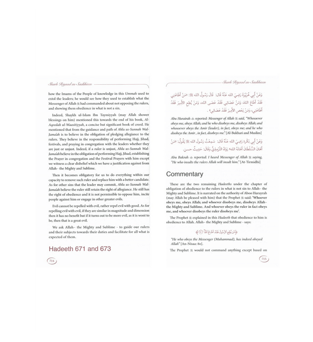 This new multi-volume Sharh Riyadus-Saliheen English translation contains the detailed explanation of every hadith by the Eminent Sheikh, Muhammad bin Salih Al-Uthaymeen. Each hadith text is in Arabic, followed by the English translation and the commentary.