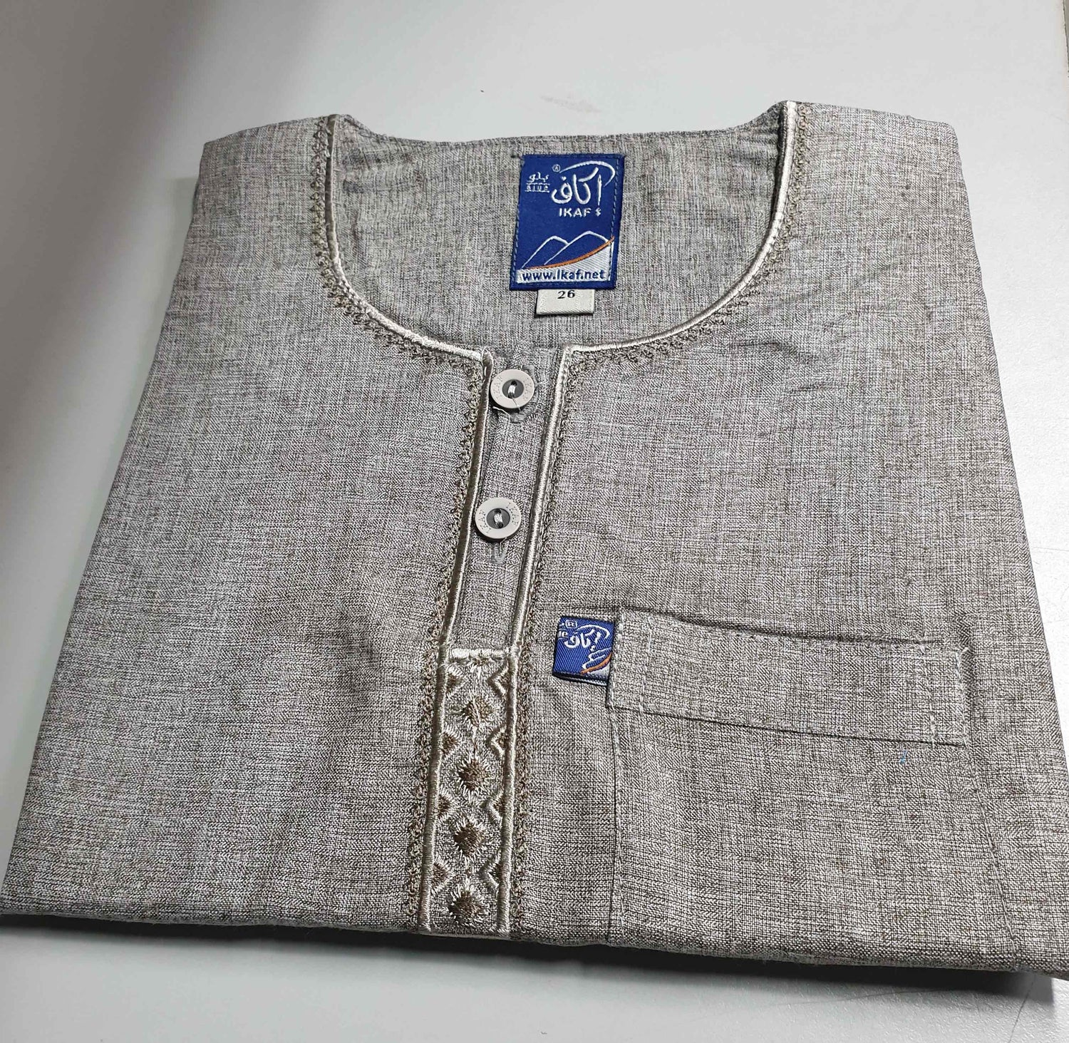 A Medium weight comfortable collarless thobe with side hidden pockets and subtle rounded V embroidered with threaded Tassel