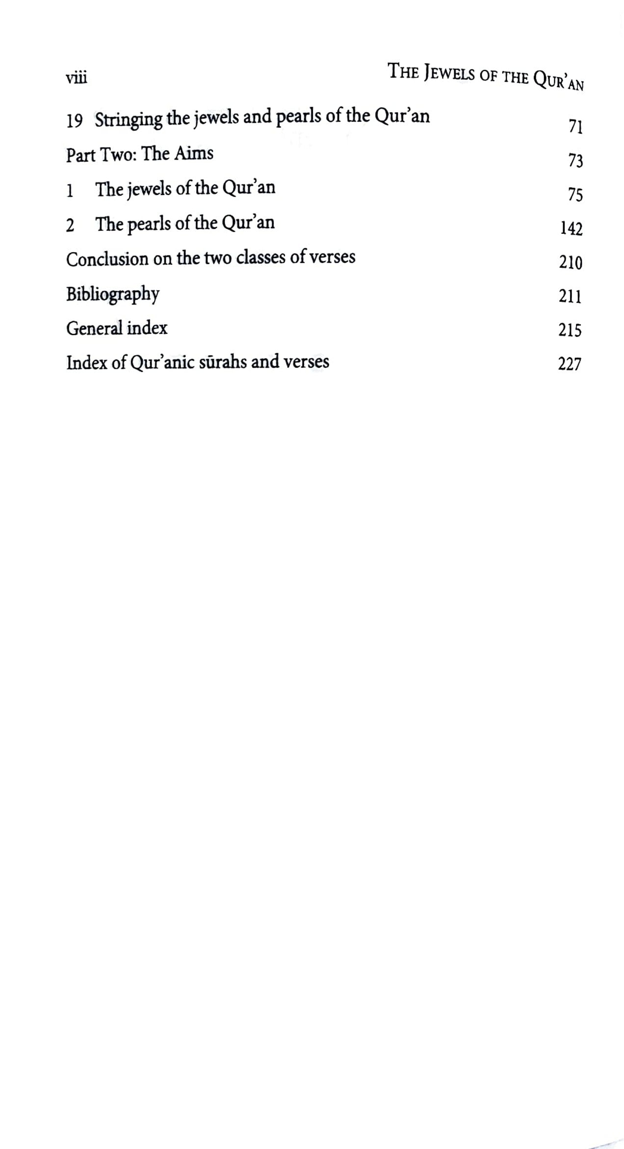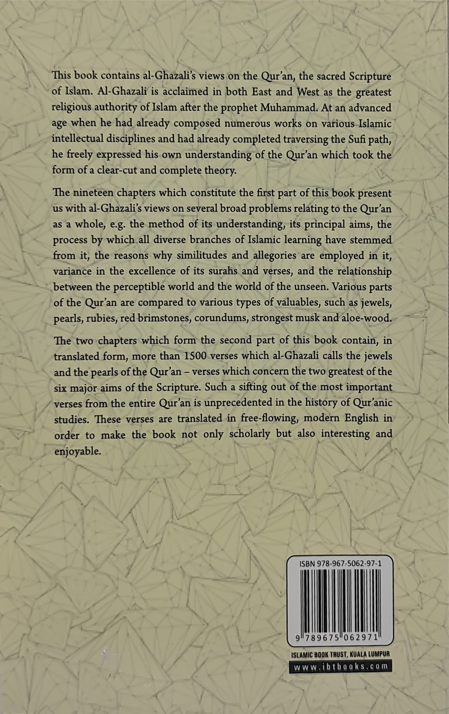 This book contains al-Ghazali’s views on the Qur’an. The nineteen chapters which constitute the first part of this book present us with al-Ghazali’s views on several broad problems relating to the Qur’an as a whole, e.g. the method of its understanding, its principal aims, the process by which all diverse branches of Islamic learning have stemmed from it, the reasons why similitudes and allegories are employed in it, variance in the excellence of its surahs and verses, and the relationship between the perceptible world and the world of the unseen. Various parts of the Qur’an are compared to various types of valuables, such as jewels, pearls, rubies, red brimstones, corundums, strongest musk and aloe-wood.