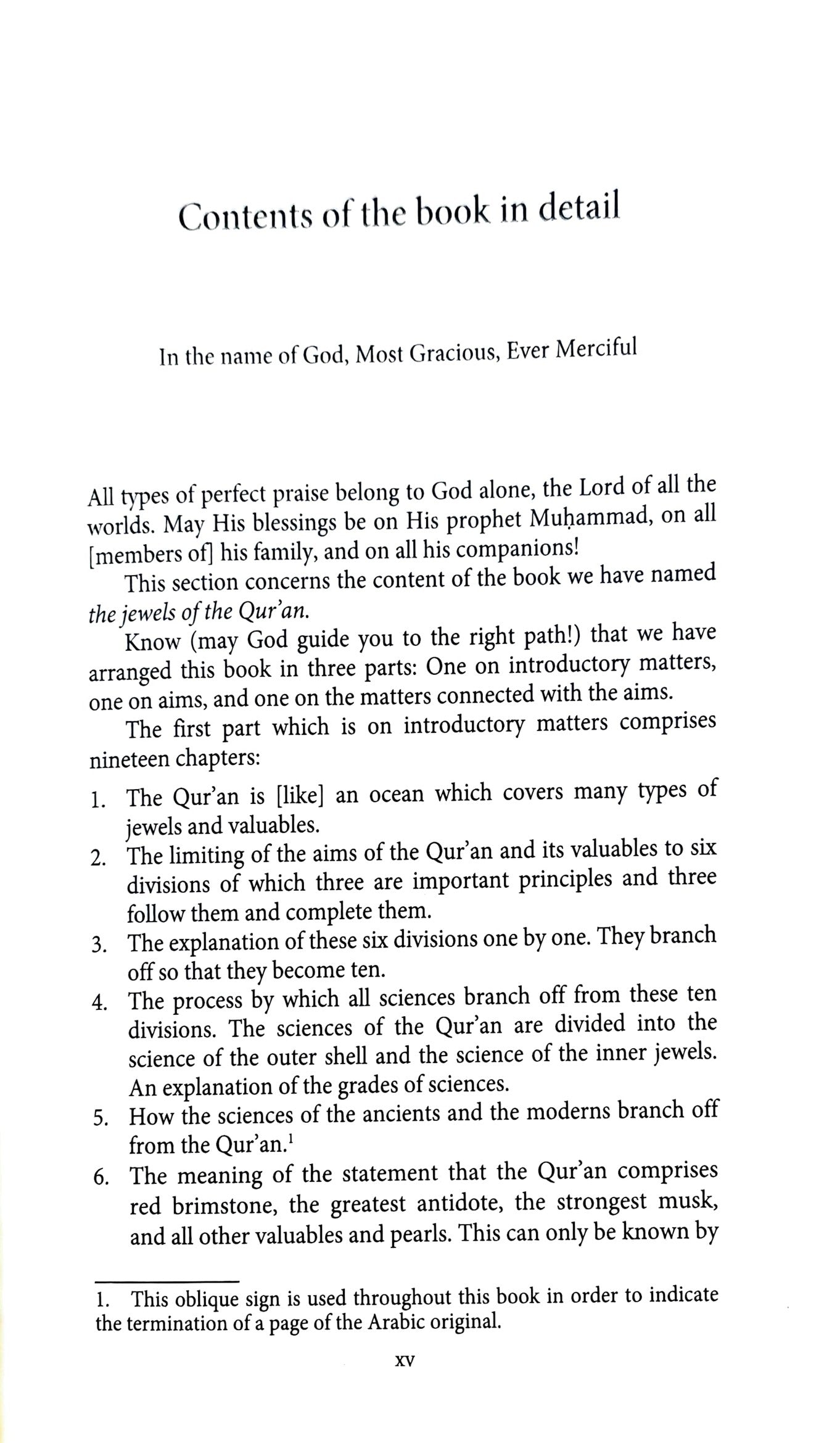 The two chapters which form the second part of this book contain more than 1500 verses which al-Ghazali calls the jewels and the pearls of the Qur’an - verses which concern the two greatest of the six major aims of the Scripture. Such a sifting out of the most important verses from the entire Qur’an is unprecedented in the history of Qur’anic studies.