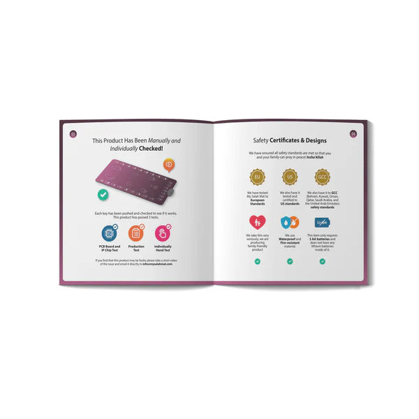 Built-In Sensors! The My Salah Mat for Adults is equipped with touch-sensitive sensors placed where the hands, feet, and forehead go during prayer. These sensors respond to your movements, providing real-time instructions, Qur’an recitations, and Duas to help you perform Salah confidently.
