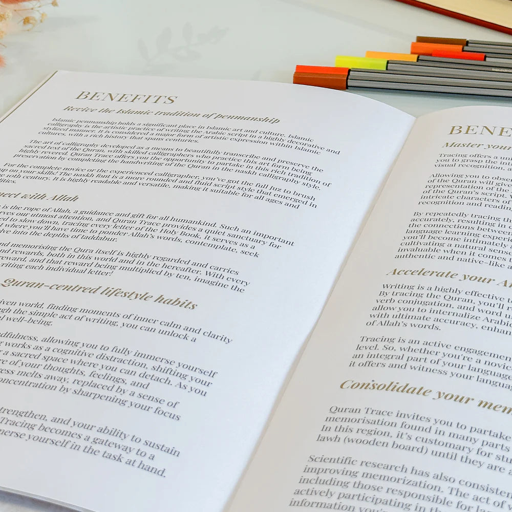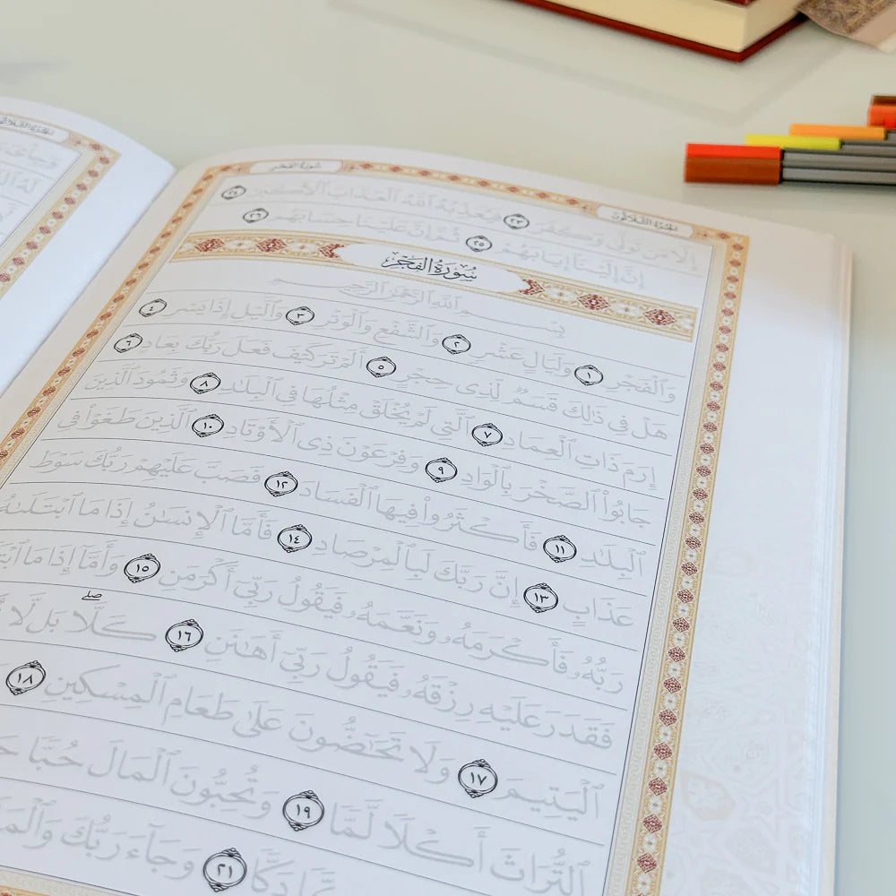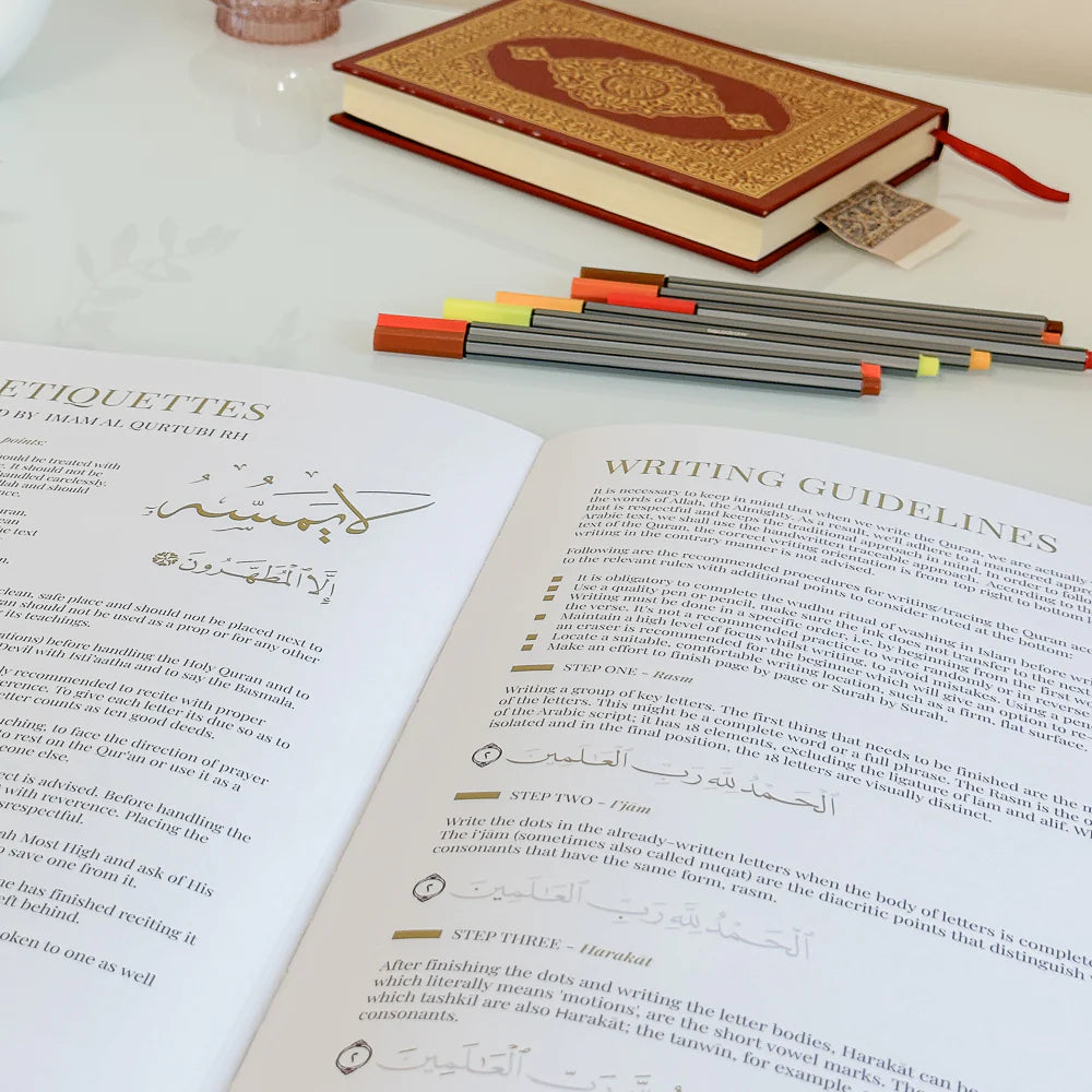 Adding to your Quranic journey, this workbook also contains an invaluable guide to Quranic writing and etiquettes inspired by the esteemed Islamic scholar Imam Al-Qurtubi. It provides contextual insights using a unique index.