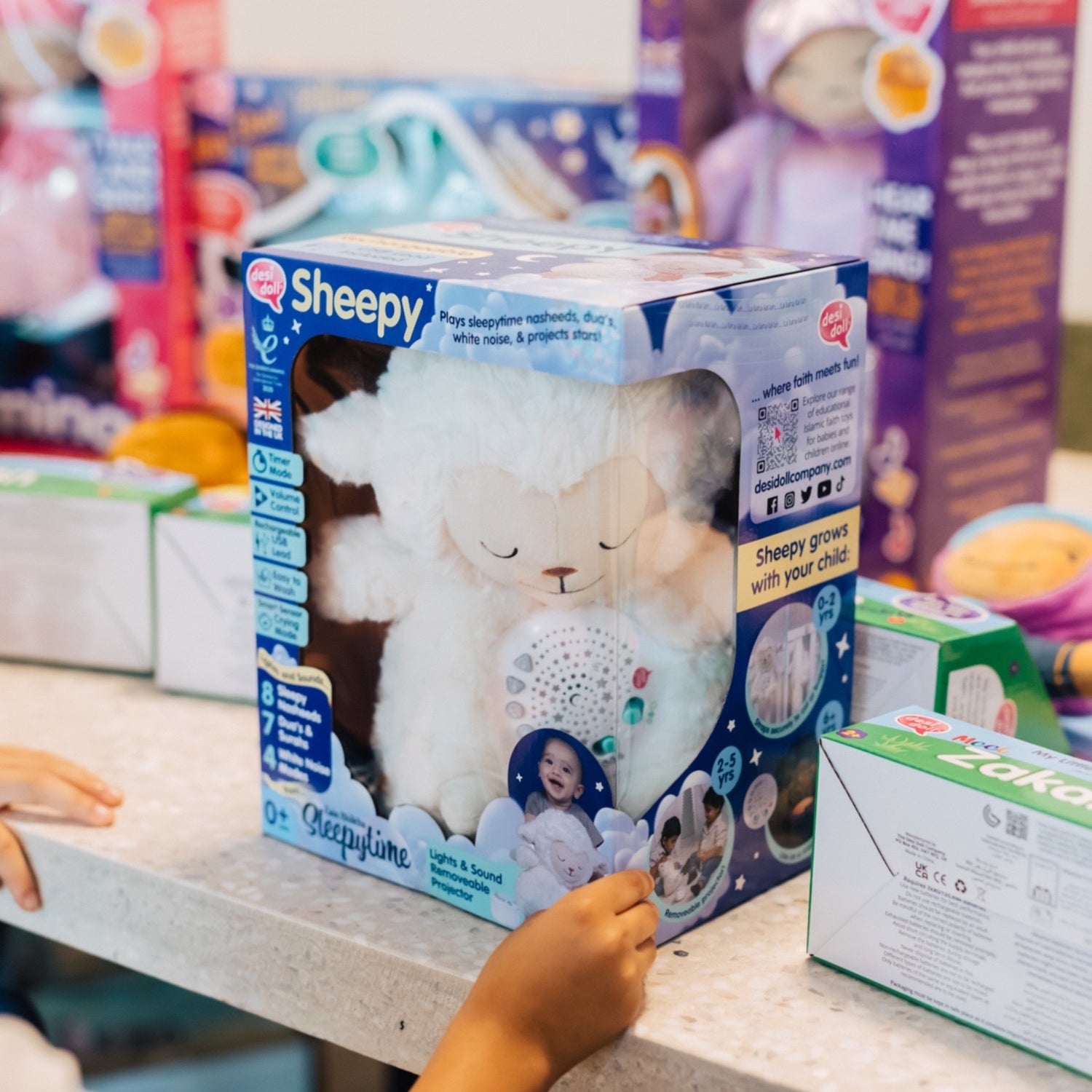 Plays sleepytime nasheeds, dua’s, white noise, & projects stars! Soft & cuddly, Sheepy soothes your baby to sleep by creating a calm environment.