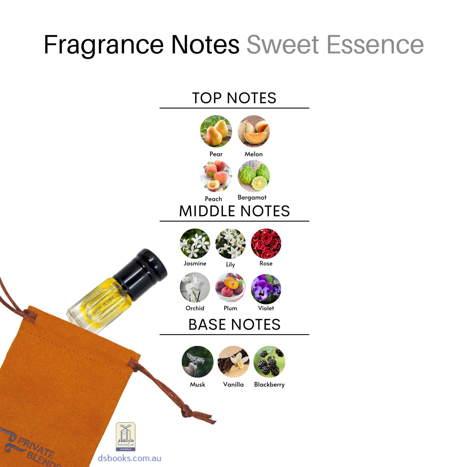 As the scent develops, it reveals a beautiful bouquet of Jasmin, Lily, Rose, Orchid, Plum, and Violet. Finally, the fragrance settles with an alluring blend of Musk, Vanilla, and Blackberry notes that leave a lasting impression.