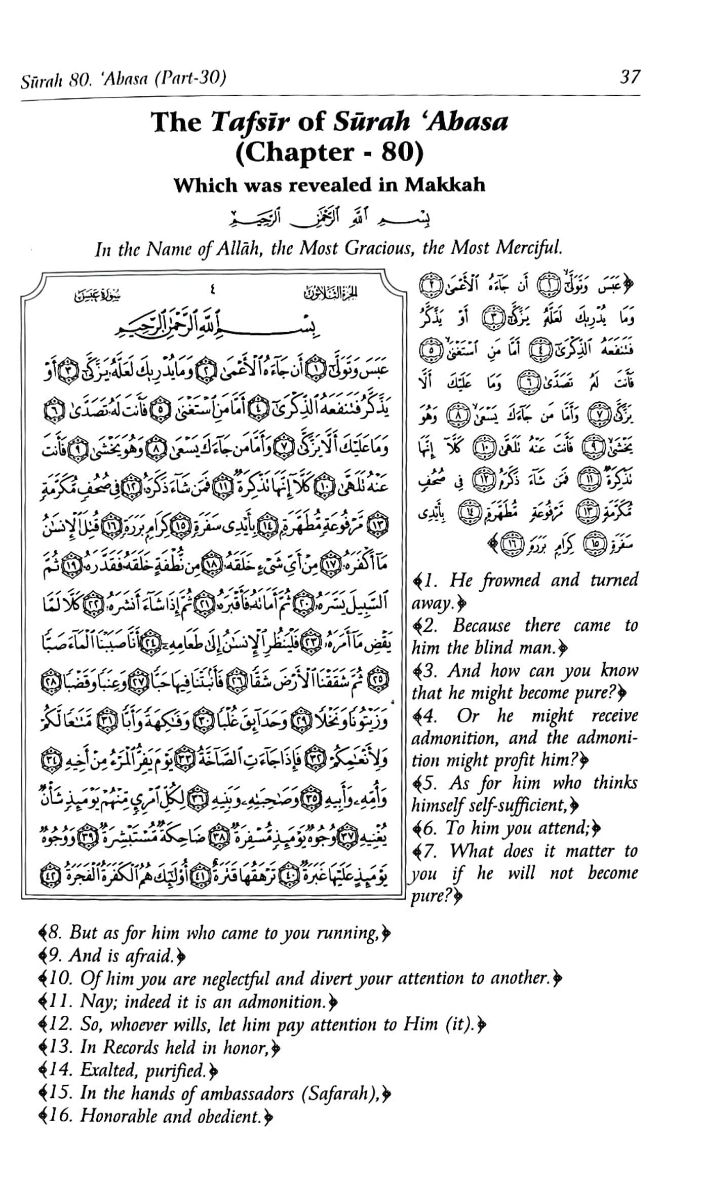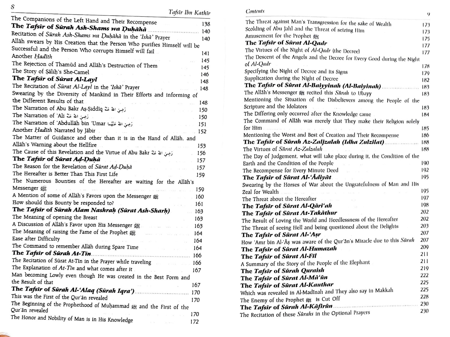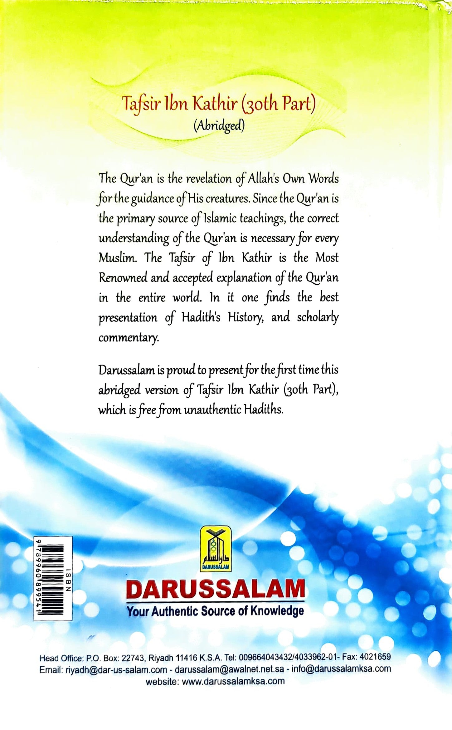 The 30th part of Tafsir Ibn Kathir is brief in form but comprehensive in interpretation. The meanings of the Qur'an have been interpreted by the Qur'an itself or by the traditions of the Prophet(S) and are enlightened with the thoughts and perception of the Salaf Saliheen; this is the cause that this renowned commentary is famous and favorite towards understanding the Noble Qur'an. The Qur'an is the revelation of Allah's Own Words for the guidance of His creatures. Since the Qur'an is the primary source of Islamic teachings, the correct understanding for the Qur'an is necessary for every Muslim.