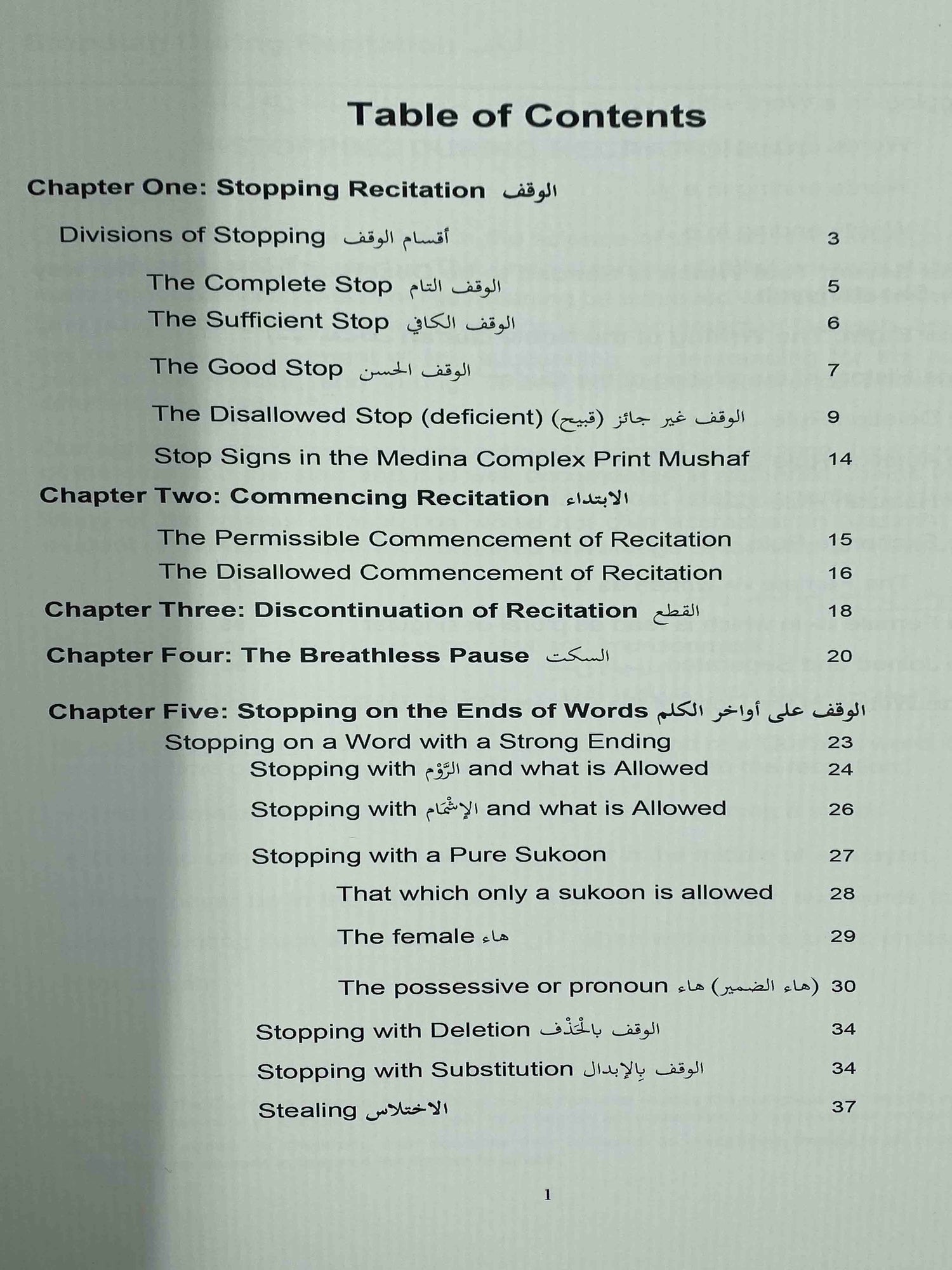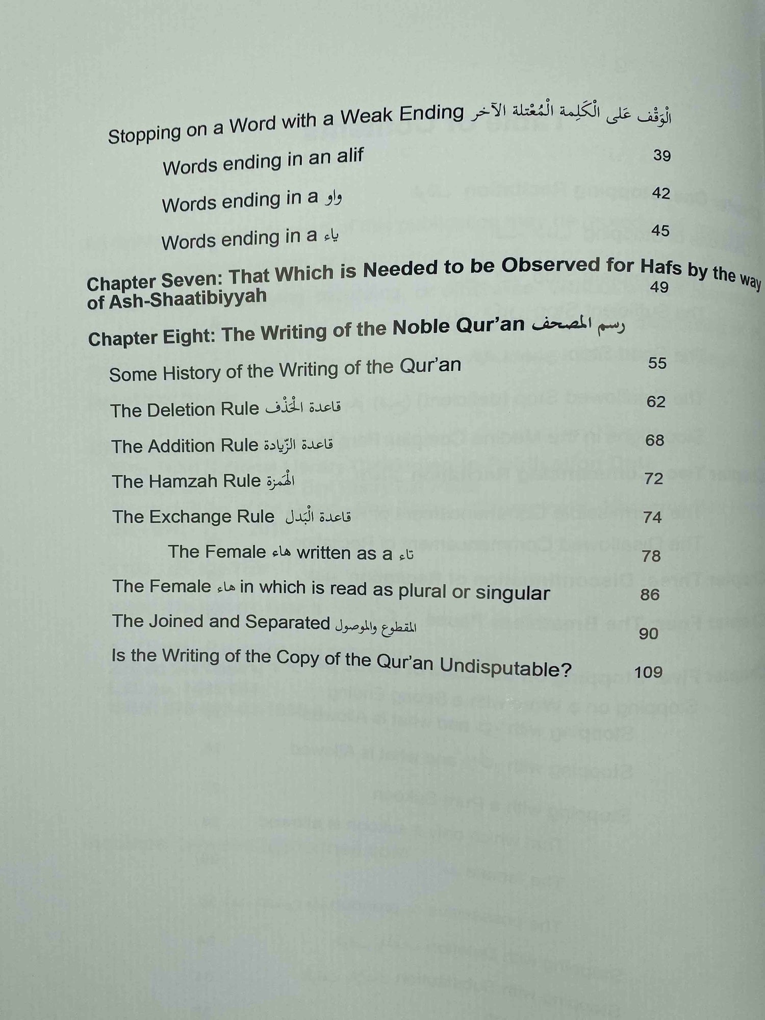 This final book explains the stop and start when reading the Glorious Qur'an, and gives details as to what kind of stop is allowed, what kind preferred, and what kind of stop is forbidden. Stopping on the ends of words with strong endings (consonants)and rules for what is allowed on the last letter of the word is described, including and Stopping on the ends of words with weak endings (words ending in the alif, ya' or wow) and different rules and explanations for these type of words is clarified. One important aspect of Qur'an recitation is knowing and understanding which word combinations are written together and which separately in different parts of the Qur'an as well as in which places of the Qur'an are some words are written with the female and in which places they are written with the This part lays out the different places in the Qu'ran these occurrences take place, so the reader knows how he/she can stop on these words. The words that are read in a special way, or have two allowed ways for the reading of Hafs from 'Aasim by the way of Ash-Shaatibiyyah are detailed in this book. The history of the writing of the Glorious Qur'an (– ) and the general rules for the writing of the Qur'an are laid out in the last chapter of this part