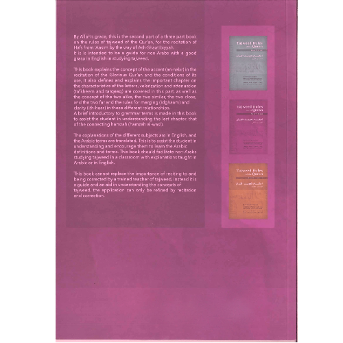 By Allah's grace, this is the second part of what shall be, insha' Allah, a three part series on the rules of tajweed of the Qur'an, for the recitation of Hafs from 'Aasim by the way of Ash-Shaaibiyyah. The book is intended to be a guide for non-Arabs with a good grasp in English in studying tajweed. This book explains the concept of the accent (an-nabr) in the recitation of the Glorious Qur'an and the conditions of its use, it also defines and explains the important chapter on the characteristics of the letters, velarization and attenuation (tafkheem and tarqeeq) are covered in the part, as well as the concept of the two alike, the two similar, the two close, and the two far and the rules for idghaam terms is made in this book to assist the student in understanding the last chapter, that of the connecting hamzah(hamzah al-wasl). The explanations of the different subjects are in English and the Arabic terms are translated. This is to assist the student in understanding and encourage them to learn the Arabic definitions and terms. This book should facilitate non-Arabs studying tajweed whether they are in a classroom with explanations taught in Arabic or in English. This book cannot replace the importance of reciting to and being corrected by a trained teacher of tajweed, instead it is a guide and an aid in understanding the concepts of tajweed, the application can only be refined by recitation and correction.