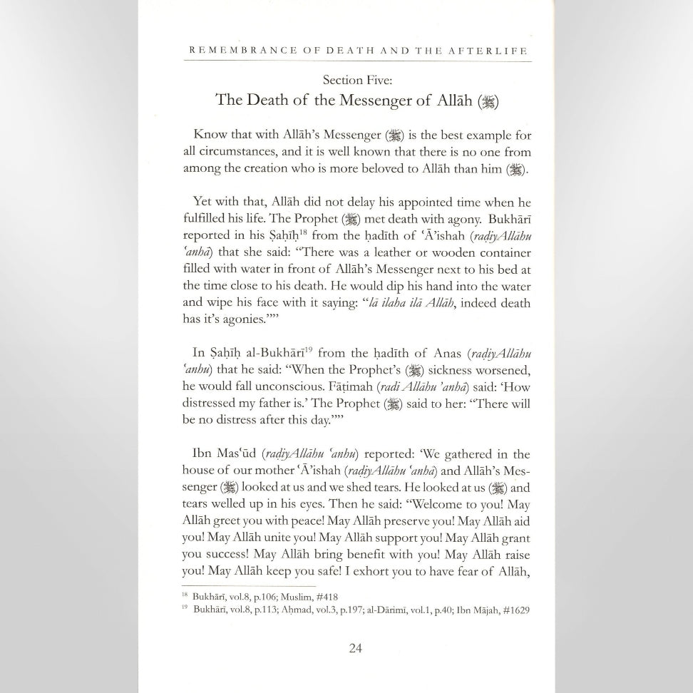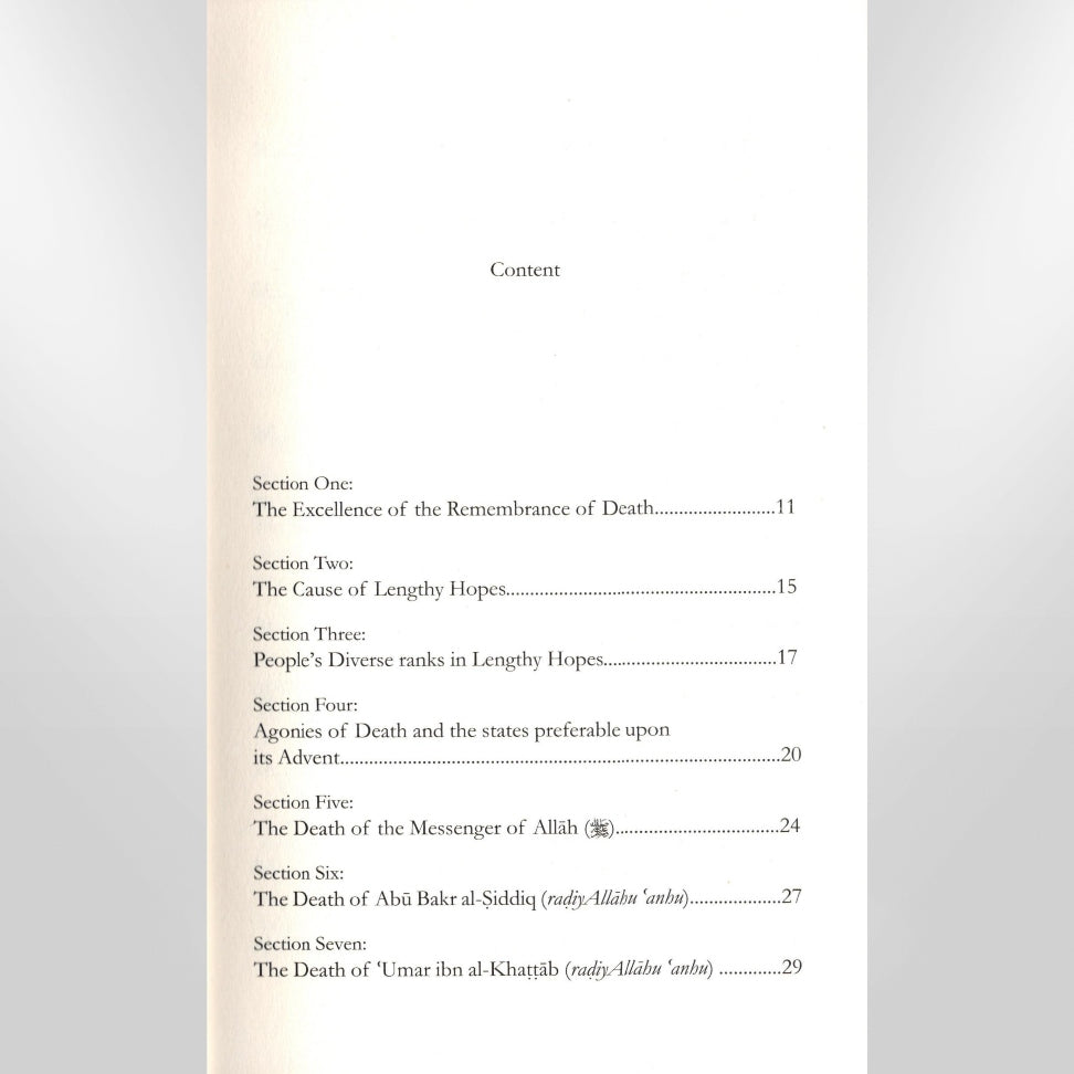 This work will awaken every soul, shaking off the slumber of idleness, firing the spirit up to prepare for the inevitable journey which needs striving and good works in order to reach salvation. This text covers many issues related to the Hereafter, taking the reader on a journey starting from remembering death, having lengthy hopes in the worldly life and learning from the deaths of the Prophet (Peace and Blessings be upon him) and his companions. The text explores the true nature of death, Hellfire, the description of Paradise, virtues of loving the Messenger and ending with never losing hope in the mercy of Allah. It is a small but powerful text which gives a comprehensive overview of the Afterlife; sure to stimulate a positive change in the reader.