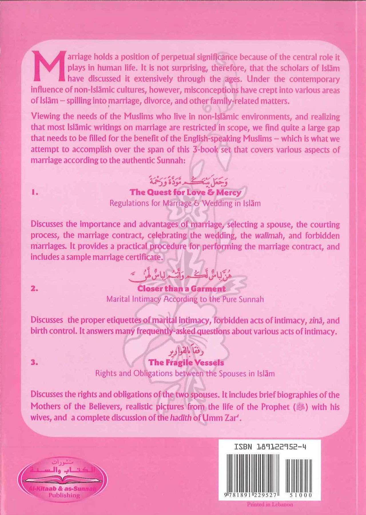 Marriage holds a position of perpetual significance because of the central role it plays in human life. It is not surprising, therefore, that the scholars of Islam have discussed it extensively through the ages. Under the contemporary influence of non-Islamic cultures, however, misconceptions have crept into various areas of Islam - spilling into marriage, divorce, and other family-related matters. Viewing the needs of the Muslims who live in non-Islamic environments, and realizing that most Islamic writings on marriage are restricted in scope, we find quite a large gap that needs to be filled for the benefit of the English-speaking Muslims - which is what we attempt to accomplish over the span of this 3-book- set that covers various aspects of marriage according to the authentic Sunnah: 1. The Quest for Love & Mercy Regulations for Marriage & Wedding in Islam Discusses the importance and advantages of marriage, selecting a spouse, the courting process, the marriage contract, celebrating the wedding, the walimah, and forbidden marriages. It provides a practical procedure for performing the marriage contract, and includes a sample marriage certificate . 2. Closer than a Garment Marital Intimacy According to the Pure Sunnah Discusses the proper etiquettes of marital intimacy, forbidden acts of intimacy, zina, and birth control. It answers many frequently-asked questions about various acts of intimacy. 3. The Fragile Vessels Rights and Obligations between the Spouses in Islam Discusses the rights and obligations of the two spouses. It includes brief biographies of the Mothers of the Believers, realistic pictures from the life of the Prophet (pbuh) with his wives, and a complete discussion of the hadith of Umm Zar.