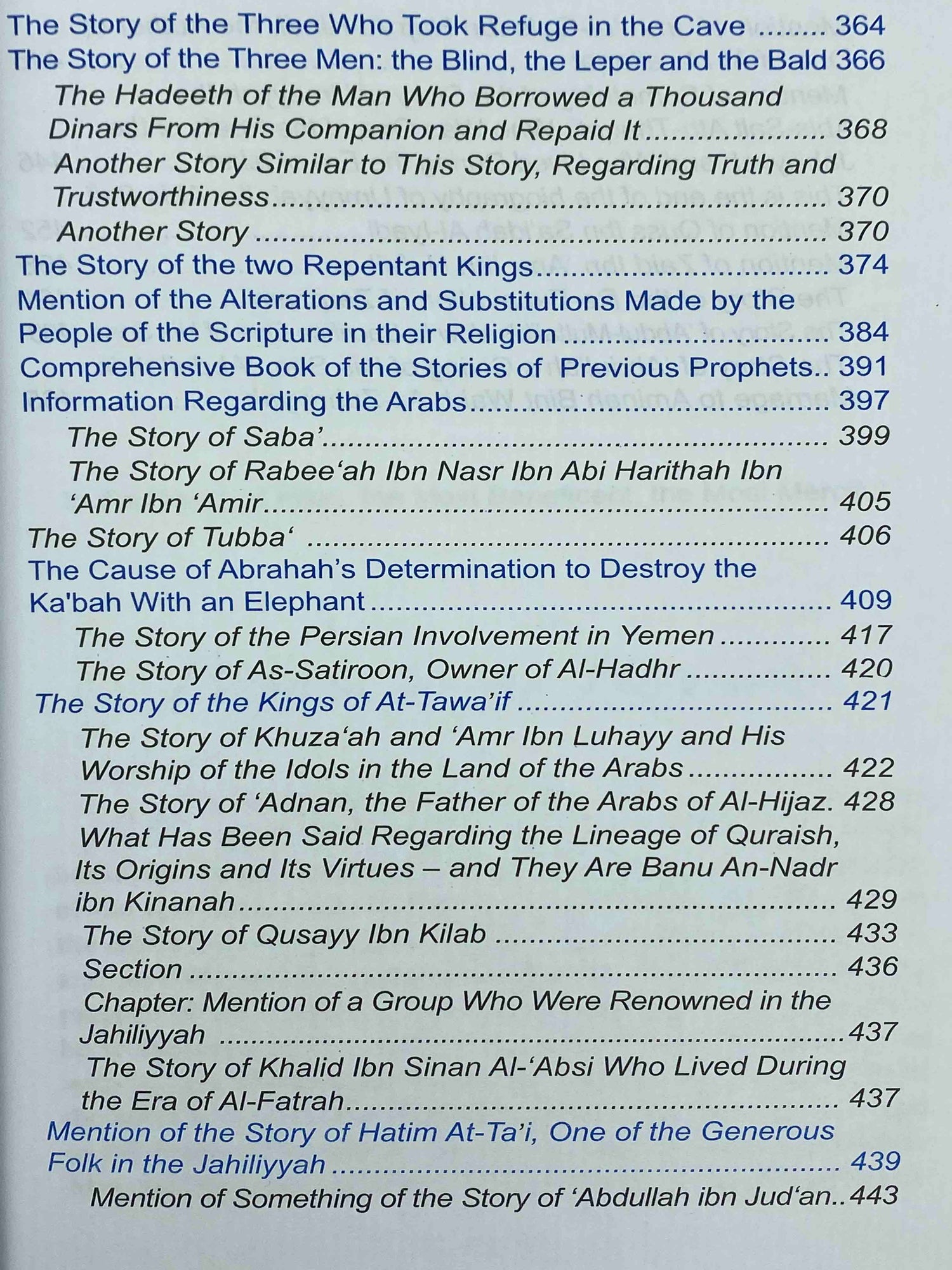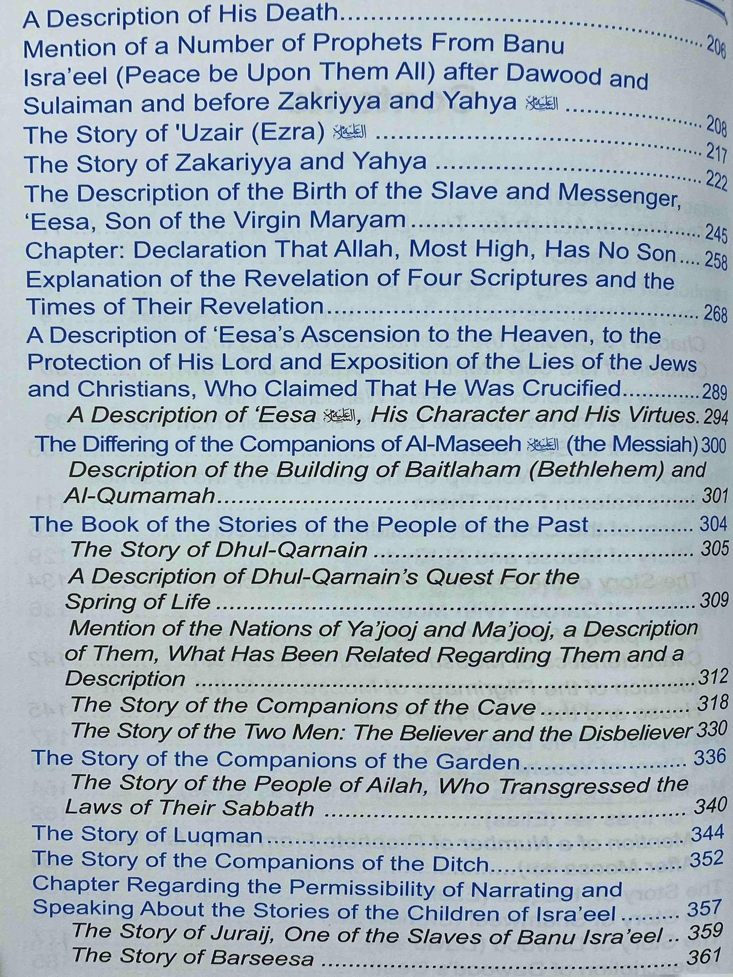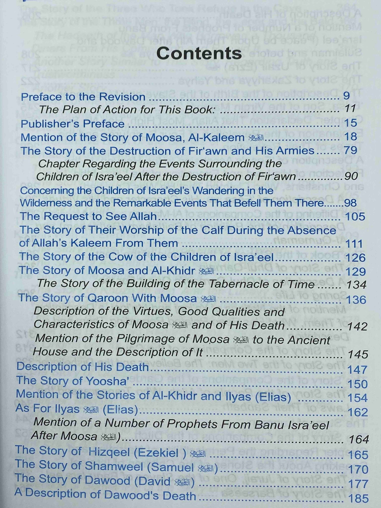 This book is an abridged English translation from the great work of Ibn Katheer, Al-Bidayah wan Nihayah. This second part consists of the stories of Prophet Musa, Samuel, Zakariyyah, Yahya, Eeesa (Jesus), Dhu’l Qarnayn, and Luqman. It also covers the children of Israa’eel (Bani Israeel), divine scriptures and past nations. The exact number of prophets and messengers sent by Allah is not known, but the Qur’an makes clear that all of the prophets were sent to various nations to preach Islamic monotheism.