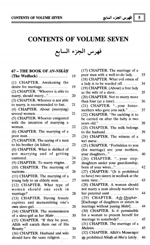 This is the unabridged version consisting of 7563 ahadith (about 4000 pages) which are presented neatly in smaller books format and printed on fine paper. Each book (subtopics in each volume categorized by very broad topics such as the Book of As-Salat) contains many chapters which represent one logical unit of Ahadith. Each book contains anywhere from one to 150 chapters with each chapter containing several Ahadith. This book will be a great addition to your library while giving you a true perspective on the traditions of the Prophet (PBUH).