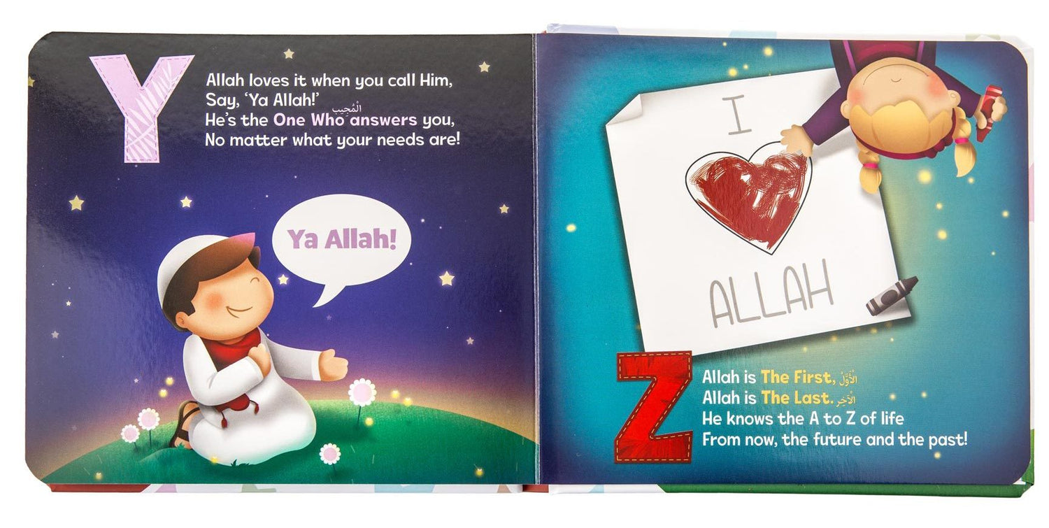 - Each letter in the alphabet covers one of Allah’s beautiful names and attributes explained in loving words threaded together using simple rhymes that will touch the heart of any child.