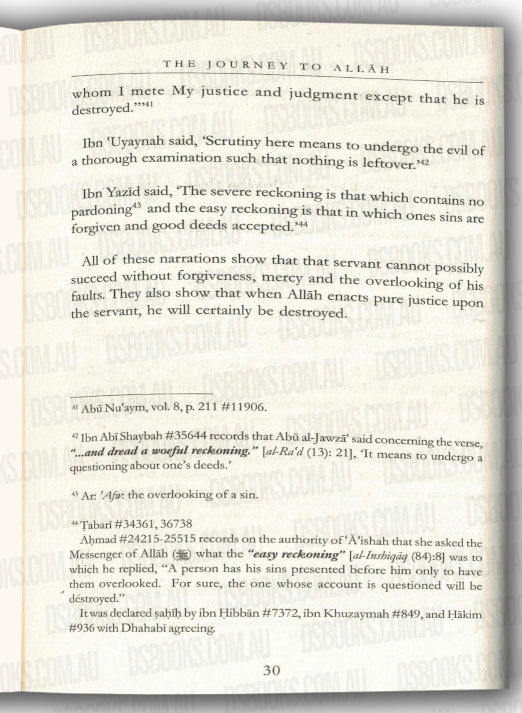 were to envelop me in His mercy. Be firm; steadfast and balanced; and journey [to Allah] in the beginning of the day, and the portion of the latter part of the night. Moderation, moderation! Through this you will attain your goal!" He also recorded this hadith in another place with the wording, "This religion is easy, none makes it hard upon himself except that it overwhelms him; therefore be firm, steadfast, and balanced; upon which have glad tidings! Seek help in this by journeying [to Allah] at the beginning of the day, at the end of the day, and a portion of the latter part of the night. Bukhari records on the authority of Abu Hurayrah that the Prophet (salallahu alaihi wa salam) said, "Your actions alone will not save any of you." They asked, 'Messenger of Allah, not even you?' He replied, "Not even me, unless Allah " He also records on the authority of Aishah that the Prophet said, "Be firm, steadfast, and balanced upon which have glad tidings for indeed actions alone will not cause one to enter Paradise." They asked, 'Messenger of Allah, not even you?' He replied, "not even me, unless Allah were to envelop me in His forgiveness and mercy." He also records on her authority that the Prophet said, "Be firm, steadfast, and balanced: know that your actions alone will not be a cause for your entry into Paradise and that the most beloved actions to Allah are those that are done continuously and persistently, even if they be few." These noble ahadith detail a great and important principle from which stem many issues related to the journey to Allah while wayfaring along His Path. Some of the Salaf said, 'The Hereafter consists either of Allah's forgiveness or the Fire; and this world is either a source of Allah's protection or a source of destruction.' On his deathbed, Muhammad ibn Wasi bid farewell to his companions saying, 'Peace be upon you, either to the Fire or to the forgiveness of Allah