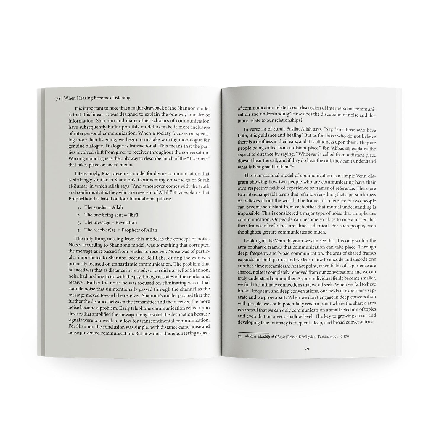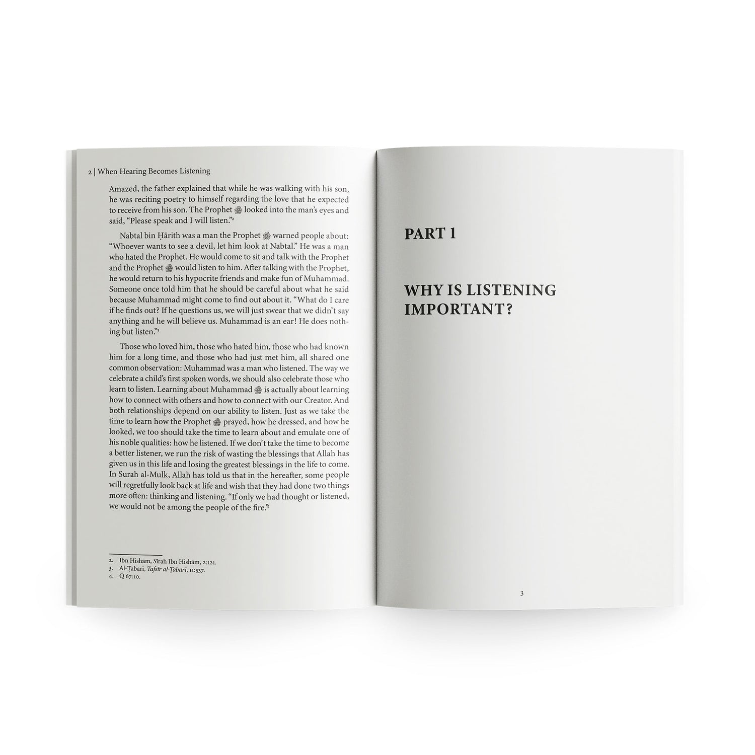 When Hearing Becomes Listening explores the religious and social implications of attachment theory and how we can all help each other develop healthy models of attachment. When Hearing Becomes, Listening explains why listening is a capacity unique to human beings and describes obstacles that prevent us from being good listeners. In this book, we present a unique, interconnected, three-level approach to listening: listening to oneself, listening to others, and listening to Allah.