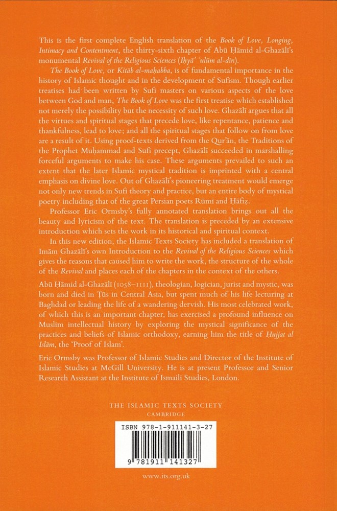 The Book of Love, Longing, Intimacy and Contentment is the thirty-sixth chapter of Abu Hamid al-Ghazali’s Revival of the Religious Sciences. This was the first treatise which established not merely the possibility but the necessity for the love of God. Ghazali argues that all the virtues and spiritual stages that precede love, like repentance, patience and thankfulness, lead to love; and all the spiritual stages that follow on from love are a result of it. Out of Ghazali’s pioneering treatment would emerge not only new trends in Sufi theory and practice, but an entire body of mystical poetry including that of the great Persian poets Rumi and Hafiz. The translation is preceded by an extensive introduction which sets the work in its historical and spiritual context.