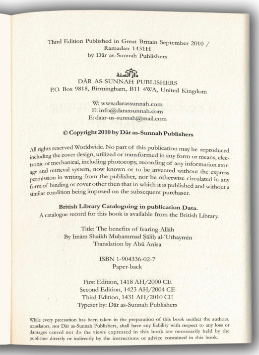The Benefits Of Fearing Allah is backordered and will ship as soon as it is back in stock.