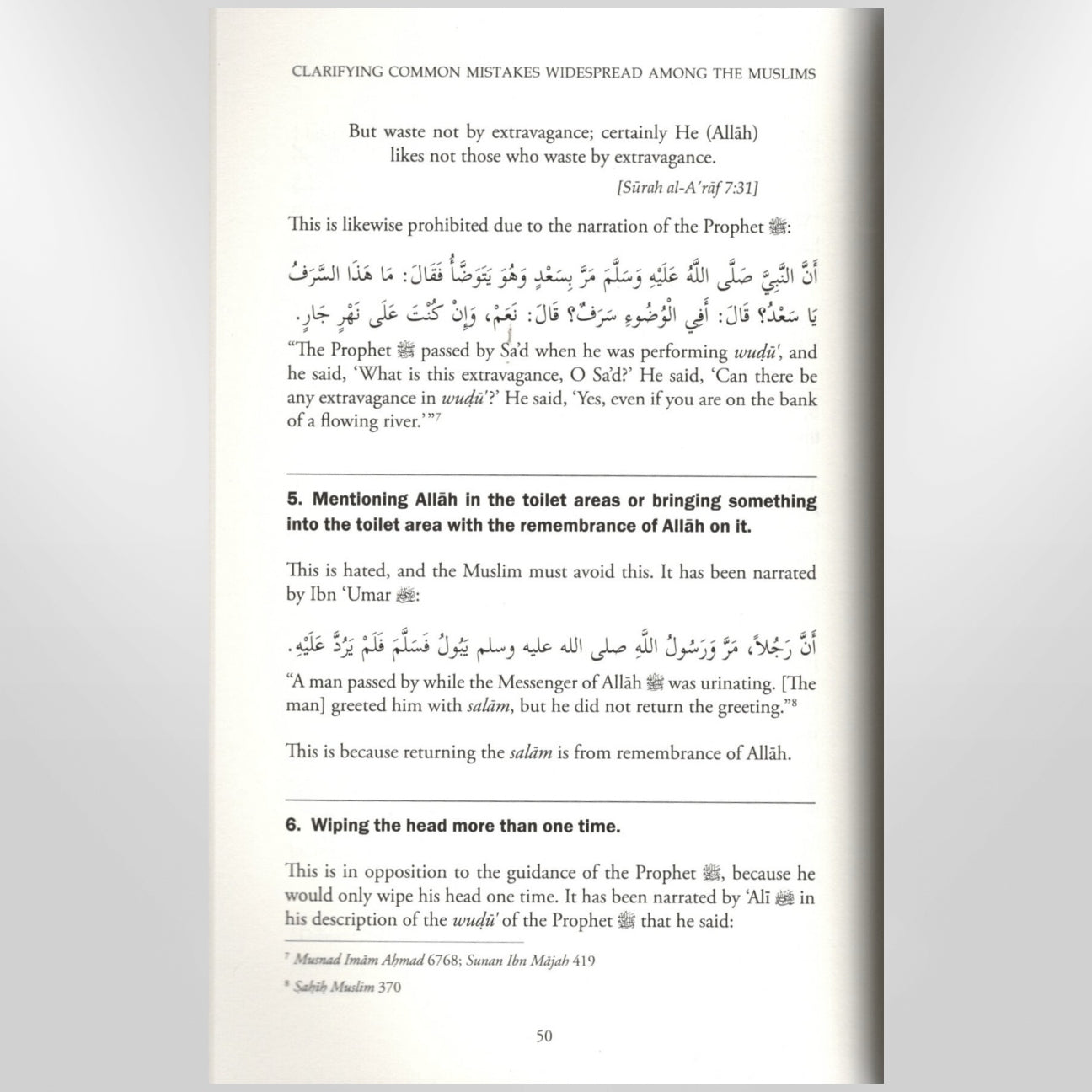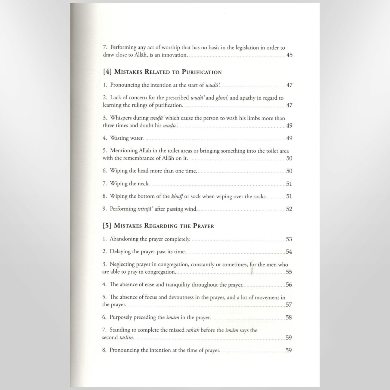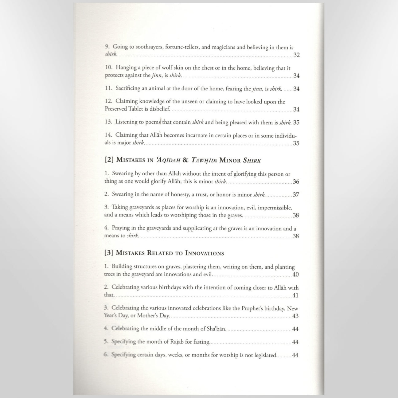 Included in this book are mistakes related to: ‘aqidah and tawḥid, innovations, jinn, fortune-tellers, poetry, birthdays, holidays, purification, prayer, du‘a’, Jumu‘ah, zakāh, fasting, Ḥajj, business transactions, sports and recreation, travel and vacation, movies, books, music, relatives, marriage, weddings, parties and social gatherings, men’s attire, women’s attire, hair and nails, photography, family matters, children, polygyny, home decor, food and drink, funerals, mourning, da’wah, and muchmore!
