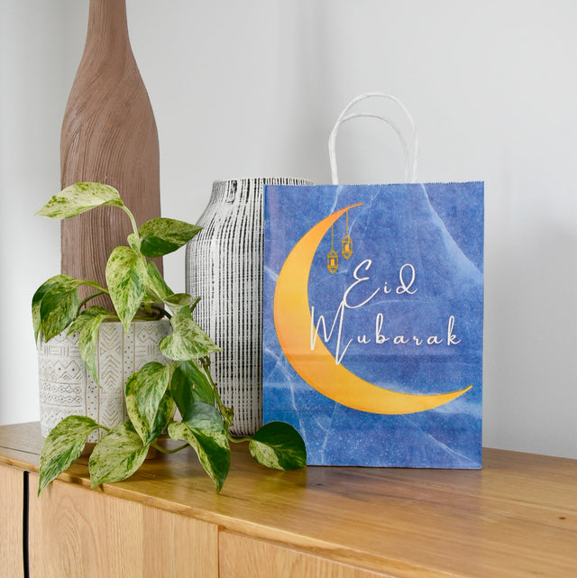 Eye-Catching Design: With vibrant blue and gold colours, our DS gift bags serve as the perfect statement piece for your Eid set-up. Let your gifts stand out with these visually appealing bags that complement any festive occasion.
