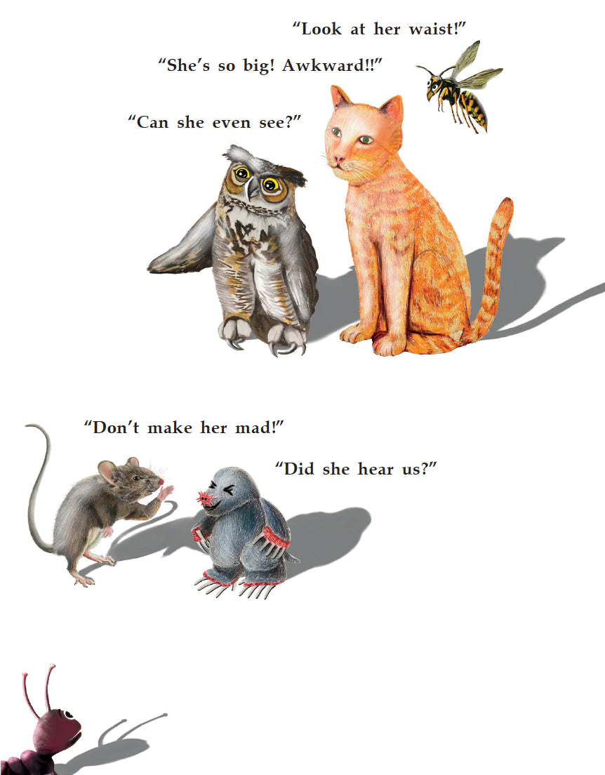 She takes Owl’s beautiful eyes, Wasp’s tiny waist, Mole’s star-shaped nose, Mouse’s dainty ears, and Cat’s long graceful limbs and TA-DA! She thinks she’s gorgeous.