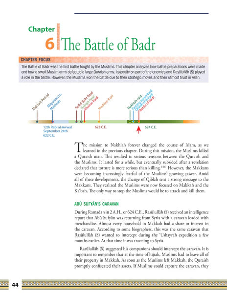 This book is for students in full-time and weekend Islamic schools. The experience and events of Rasulullah (S)’s life are explained in a manner that builds the moral and spiritual character of students. Each chapter is a separate lesson,therefore, it is ideal for one class period. The sequential development of events and connections between them are maintained from lesson to lesson. Use of timelines, maps, chapter notes and simple graphics aid in concept building.