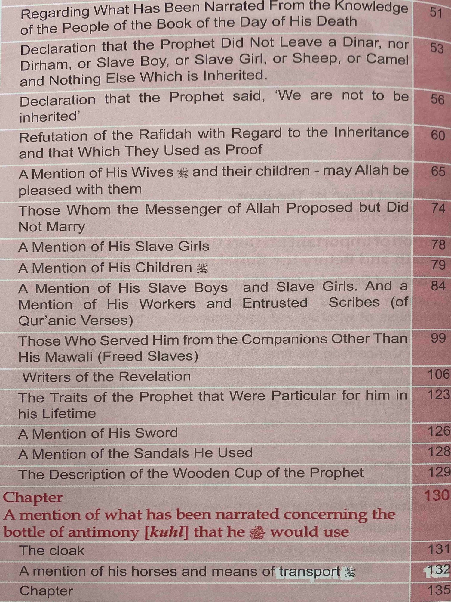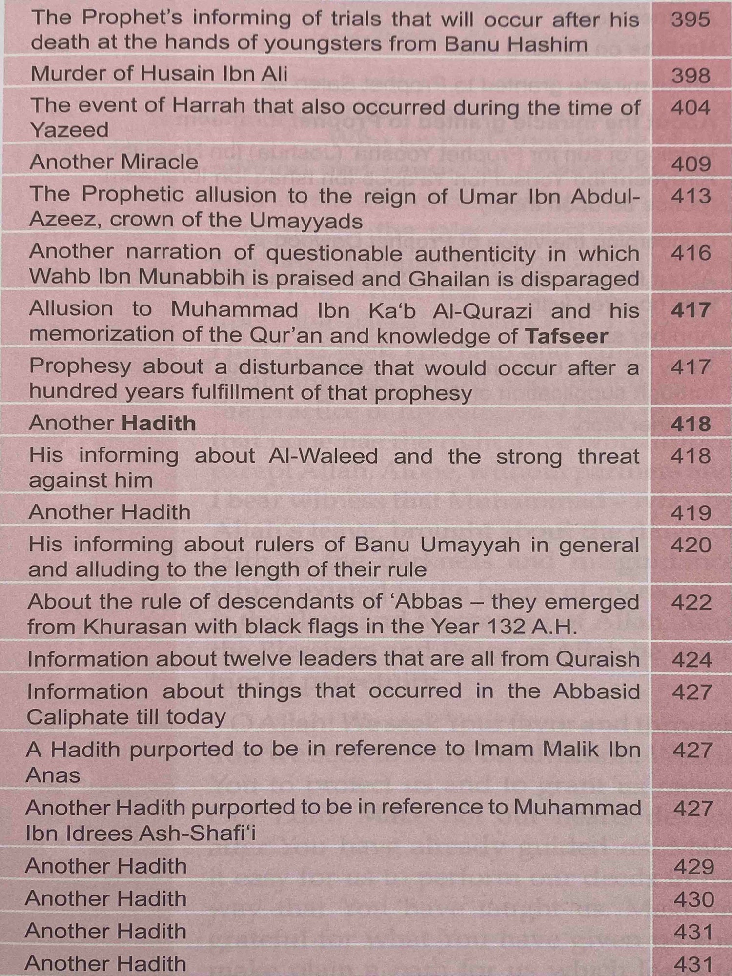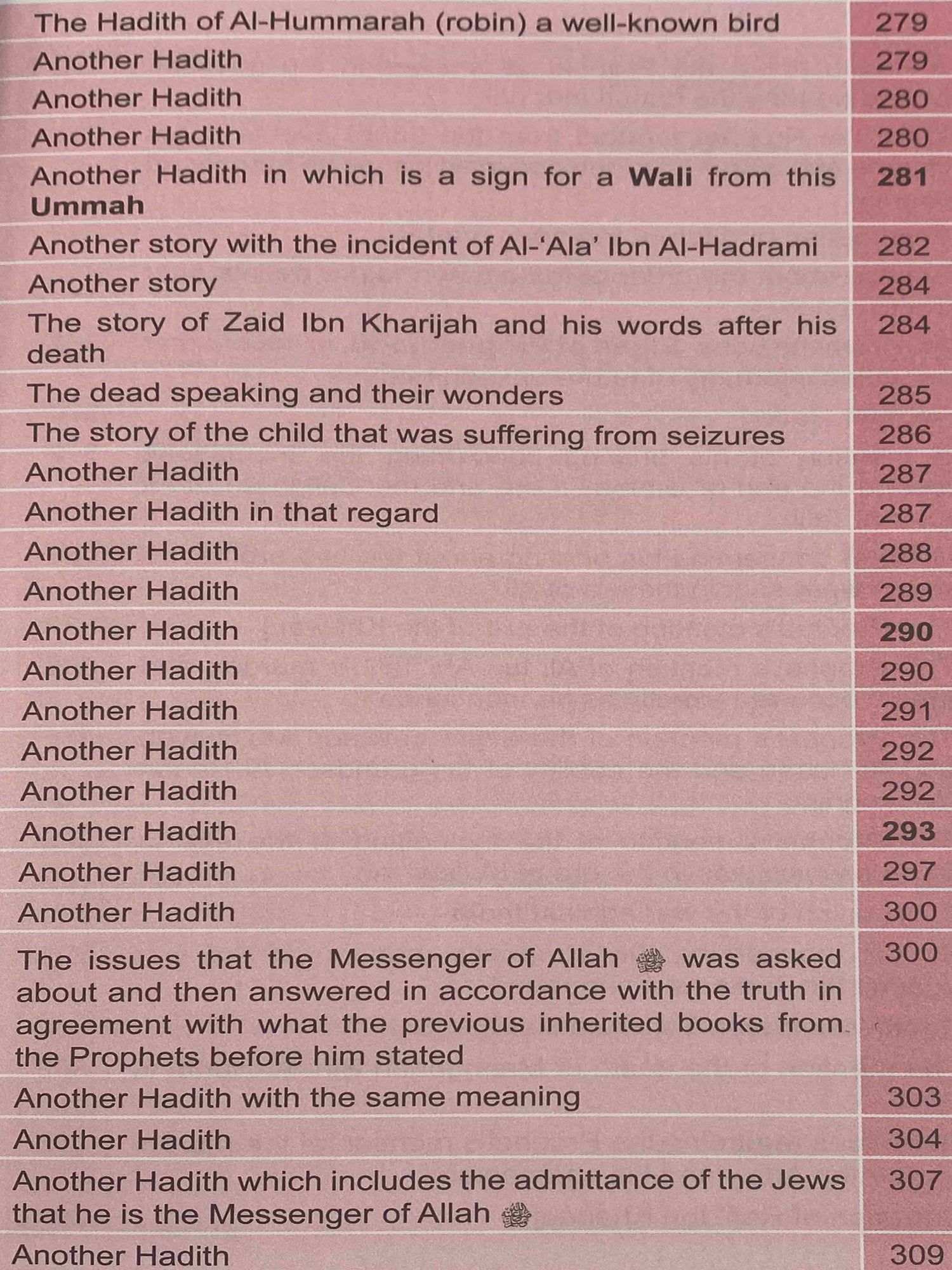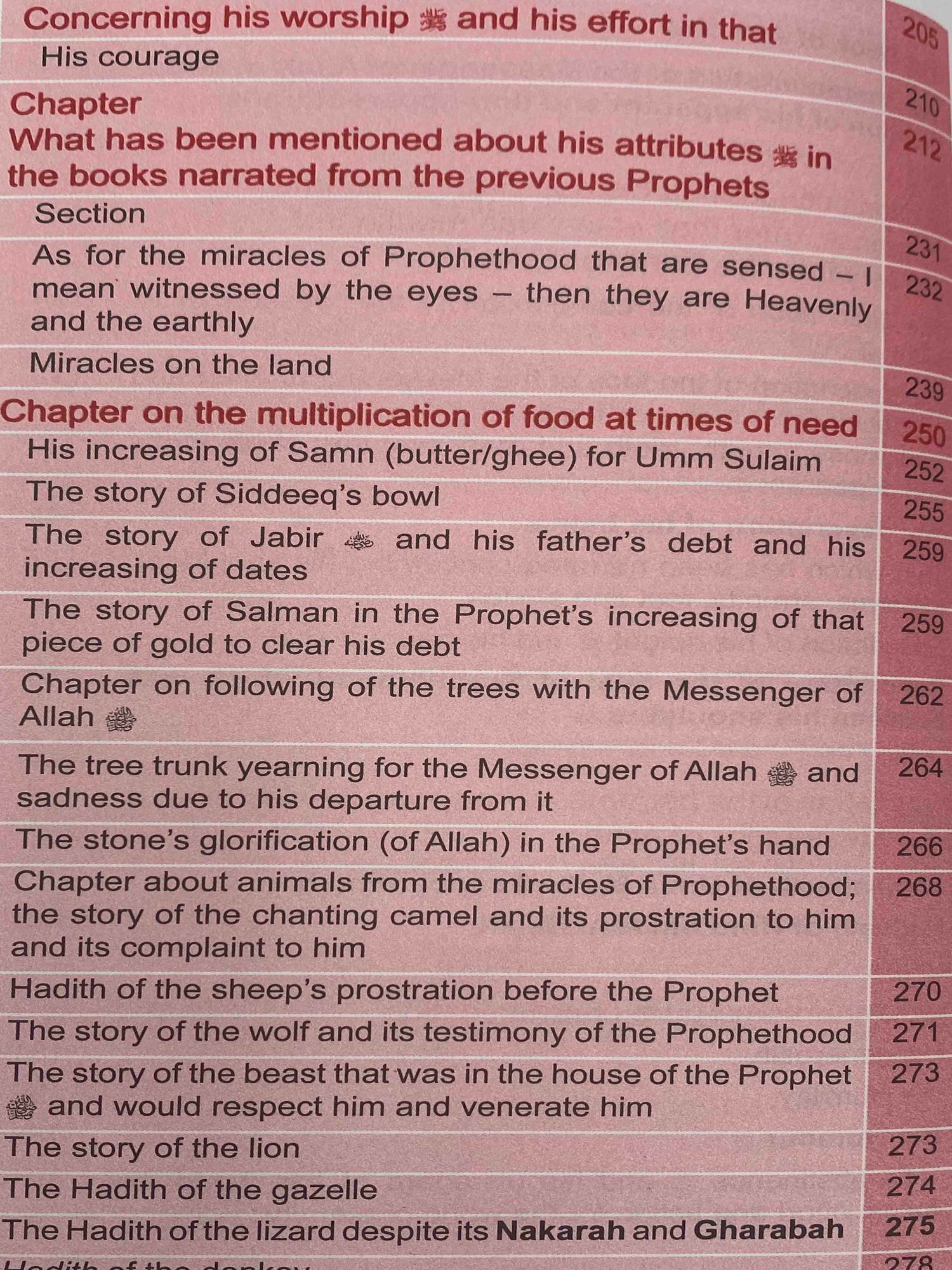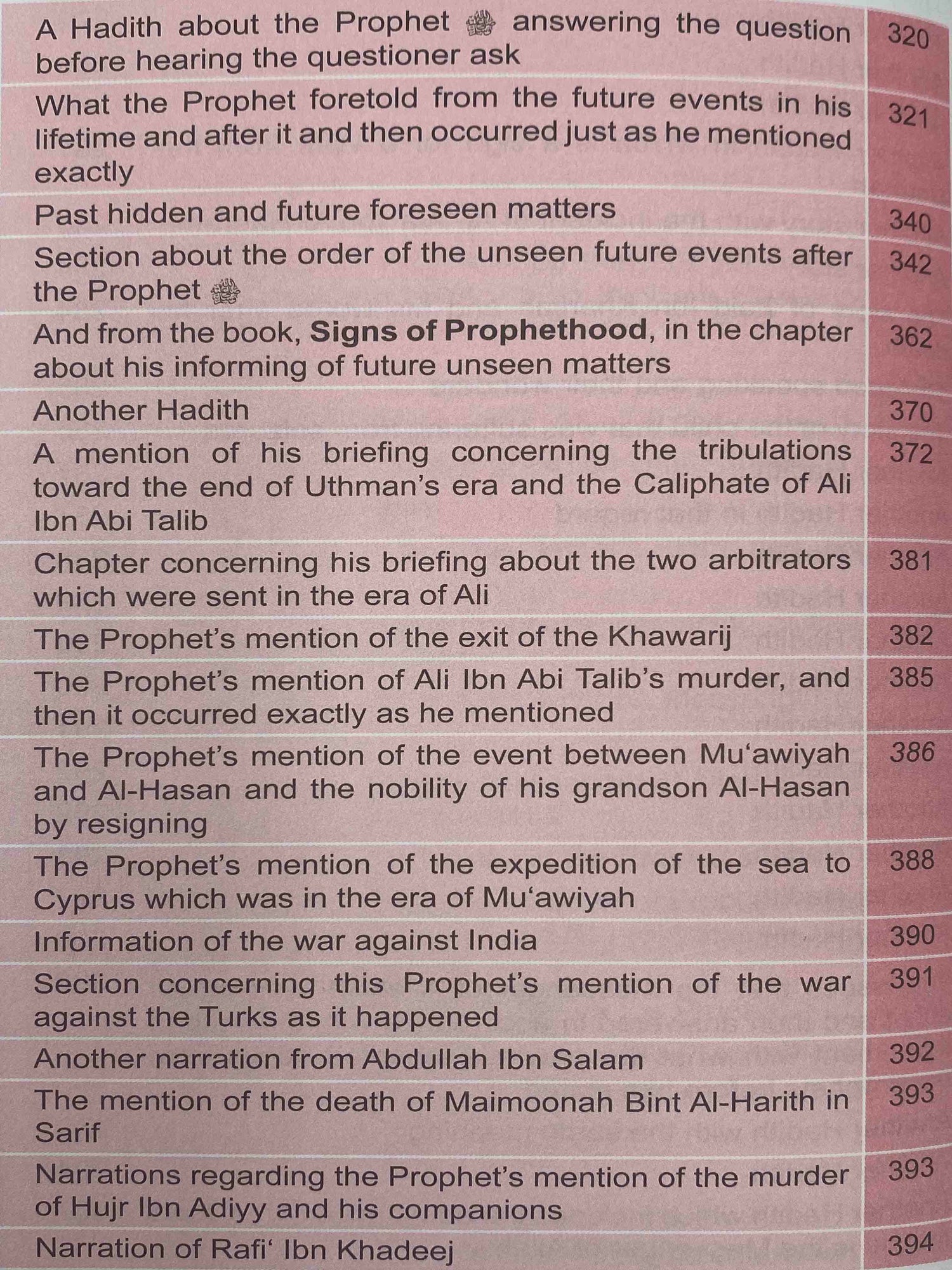 The book then discusses the blessed and beautiful characteristics and merits of the Prophet and then goes on to describe the miracles that he performed. Ibn Katheer then compares the miracles given to Prophet Muhammad with those that were given to the other Prophets; he then shows that Prophet Muhammad collectively received the same miracles that were granted to the other Prophets separately.