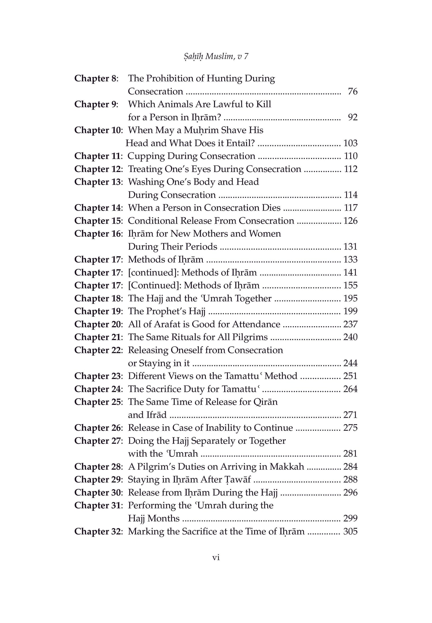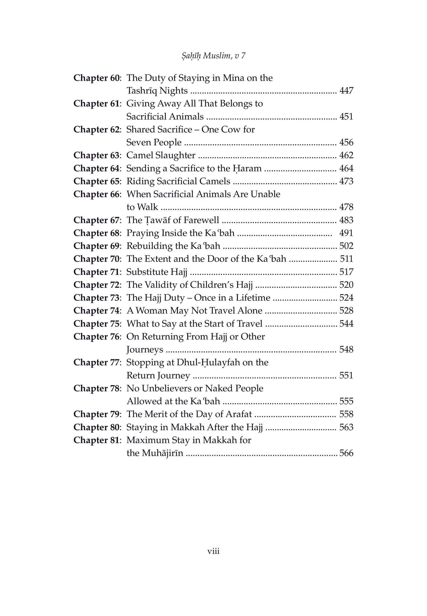 After the Qur'an, the prophetic traditions are the most recognised source of wisdom in Islam. Amongst the collected Hadith, Sahih Muslim is second only to the collection of Imam Bukhari. With a commentary by Imam Nawawi, whose other works are amongst the most widely-read books on Islam, and translated by Adil Salahi, a modern scholar of great acclaim, this immense work, finally available to English readers, is an essential addition to every Muslim library, and for anybody with interest in Islamic thought. Volume 7 contains the Book of I'tikaf and Book of Hajj, Chapters 0-81