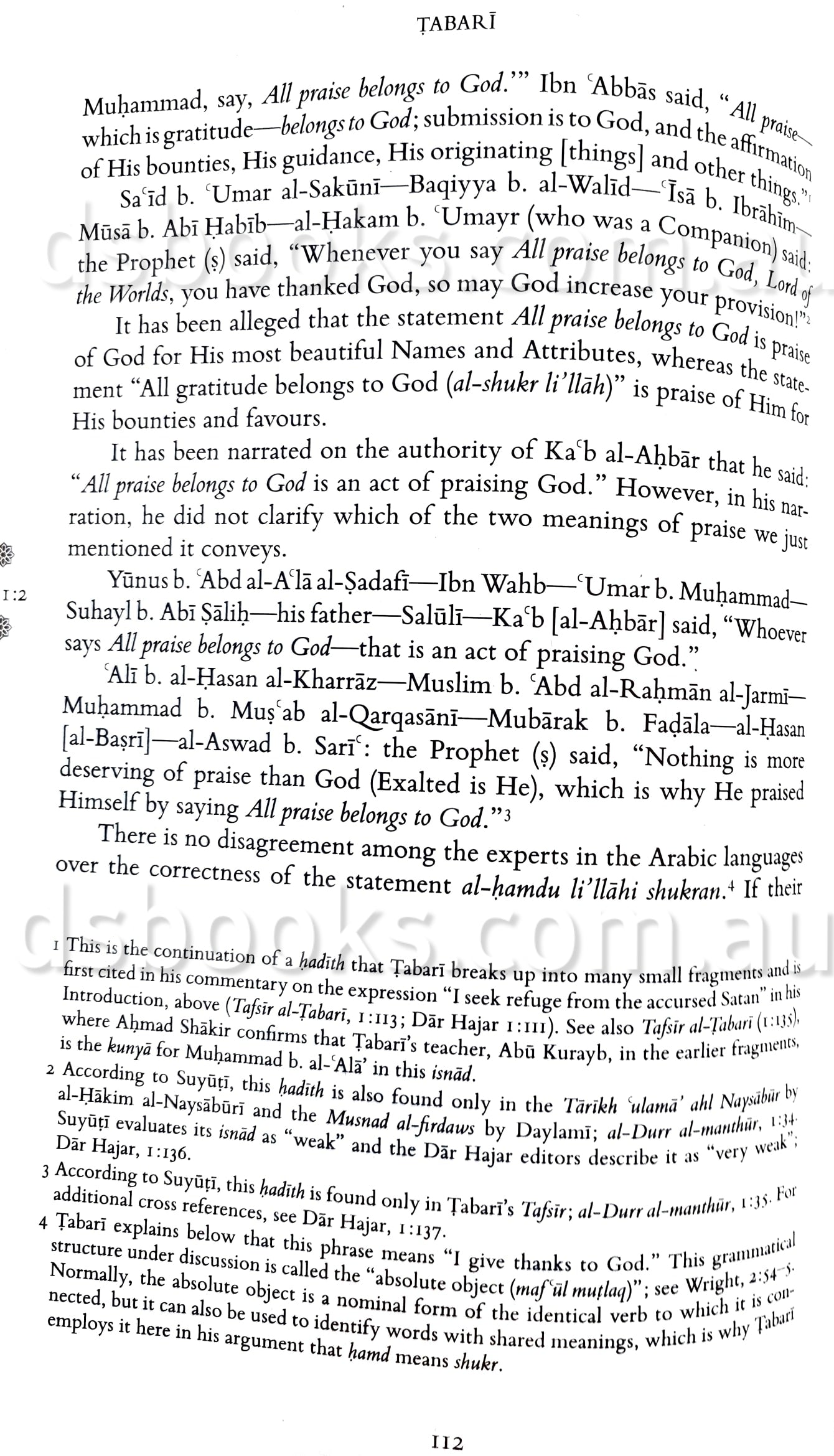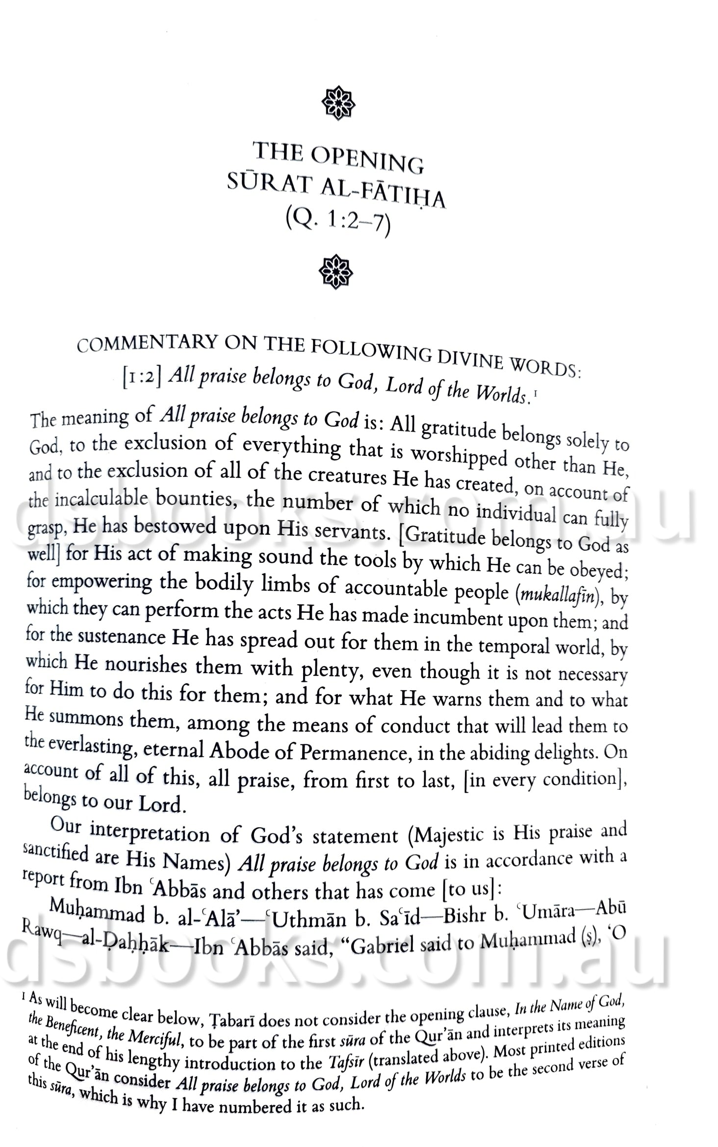 Volume I contains: Tabari’s introduction; The Opening; the Throne Verse and the final three verses from The Cow (2:255 and 284–286); The Family of ‘Imran (3:7 and 18); Repentance (9:38–40 and 128–129); the story of Moses and al-Khadir from The Cave (18:60–82); the Verse of Light from The Light (24:35–42); Prostration; Ya’ Sin.