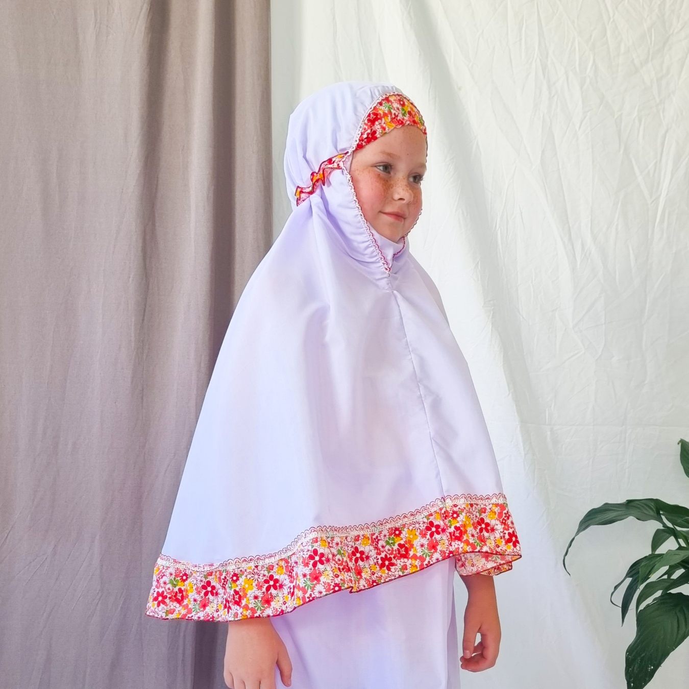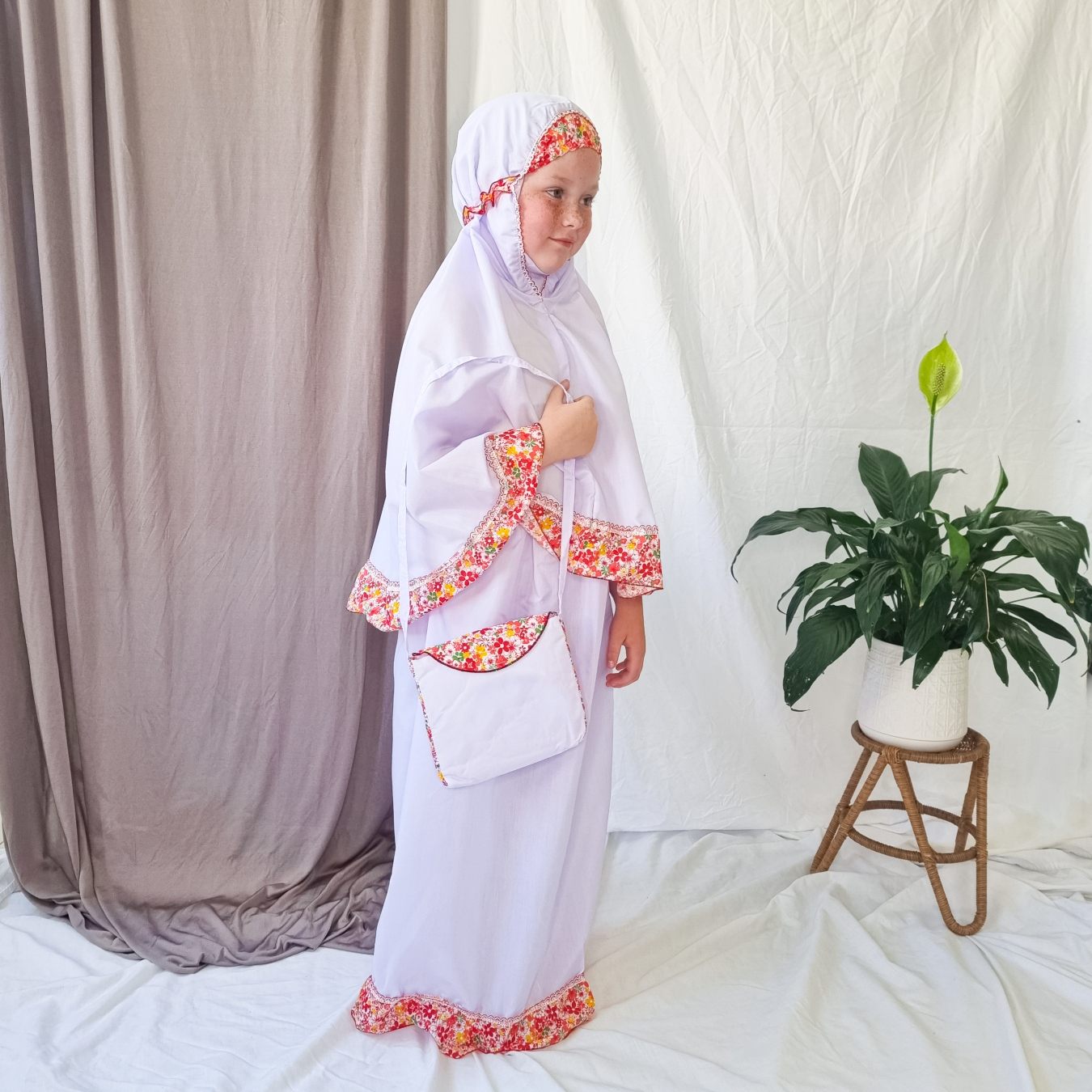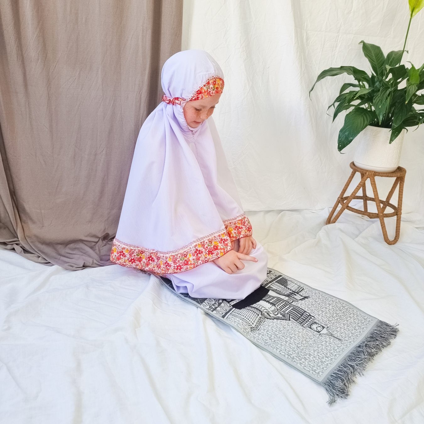 Help make salah fun for our little Muslimahs with pretty prayer clothes just for them! A sweet floral design and a matching mini bag to fold their prayer clothes into so they can take them on the go and so they can keep the hijab and skirt together in one place!