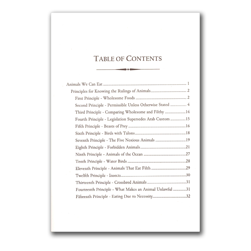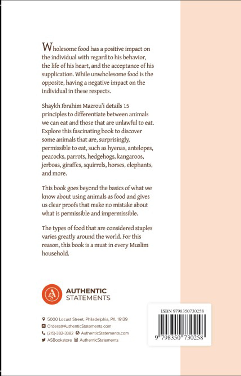 Eating wholesome food improves a person's behaviour, emotional health, and acceptance of their prayers. On the other hand, unwholesome food has a negative impact on these areas. Shaykh Ibrahim Mazrouti presents 15 principles to help distinguish between animals that we can eat and those that we cannot. This interesting book highlights some surprising animals that are permissible to eat, such as hyenas, antelopes, peacocks, parrots, hedgehogs, kangaroos, jerboas, giraffes, squirrels, horses, and elephants. The book provides clear evidence about what is allowed and what is not regarding food. Since staple foods are different in various cultures, this book is a valuable resource for every Muslim household.