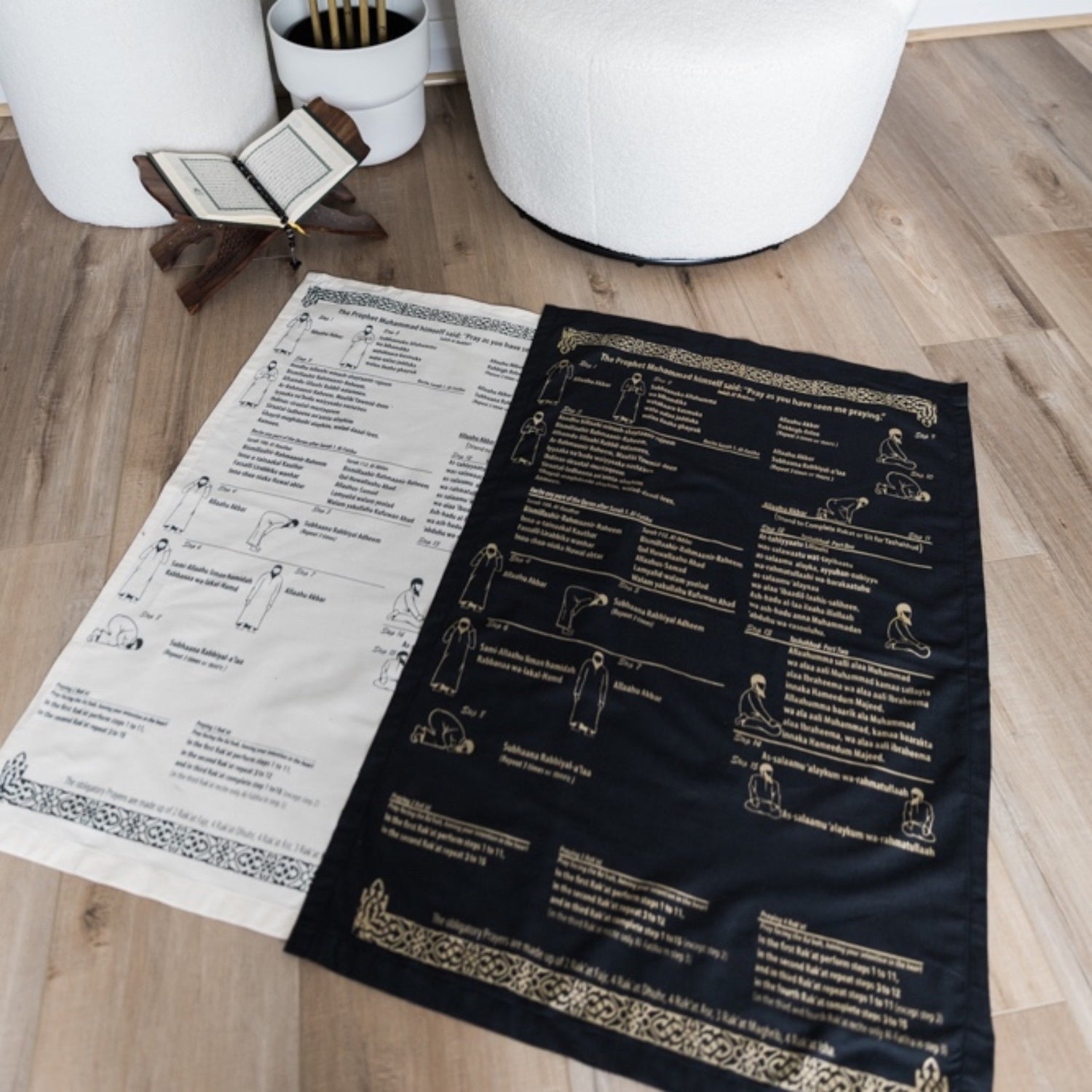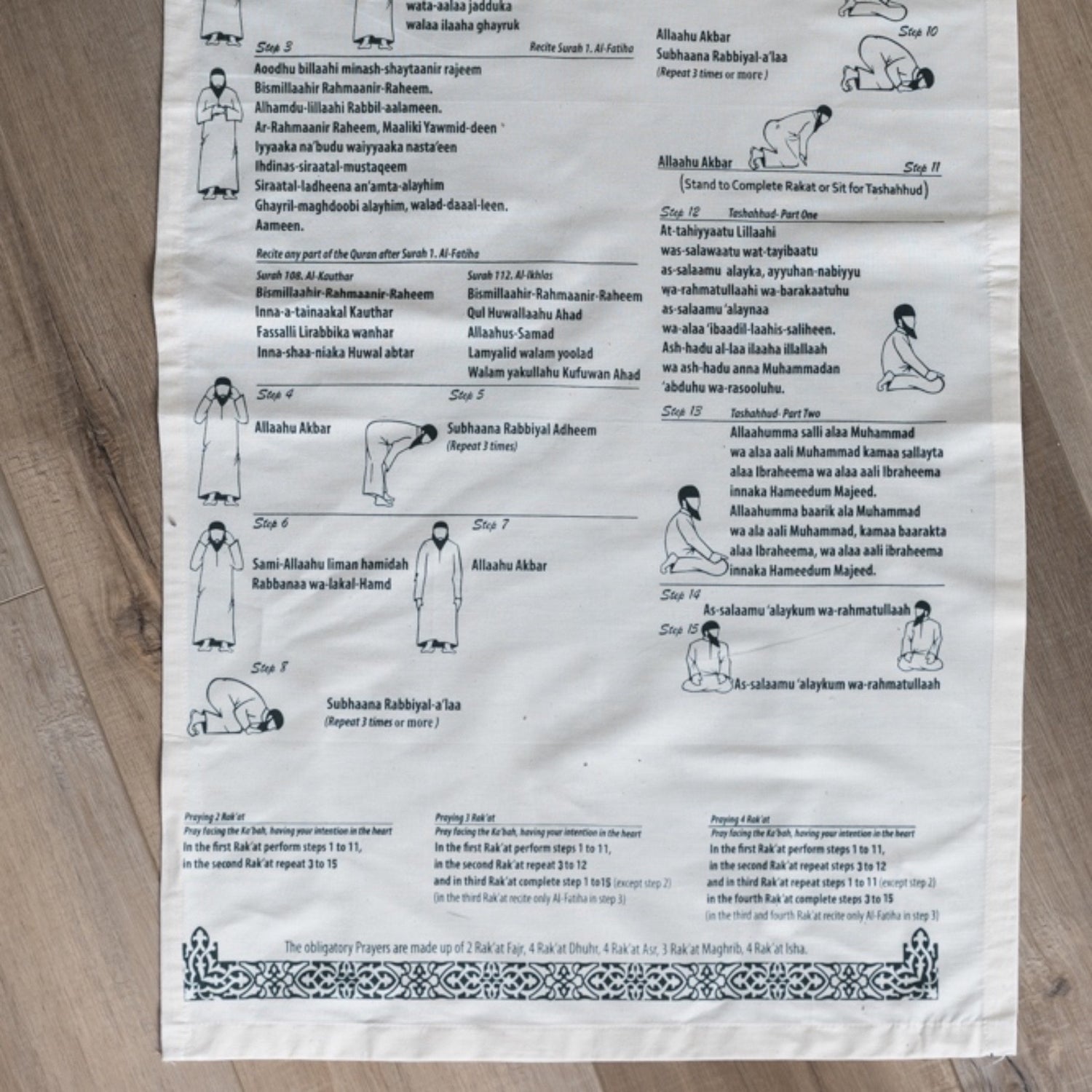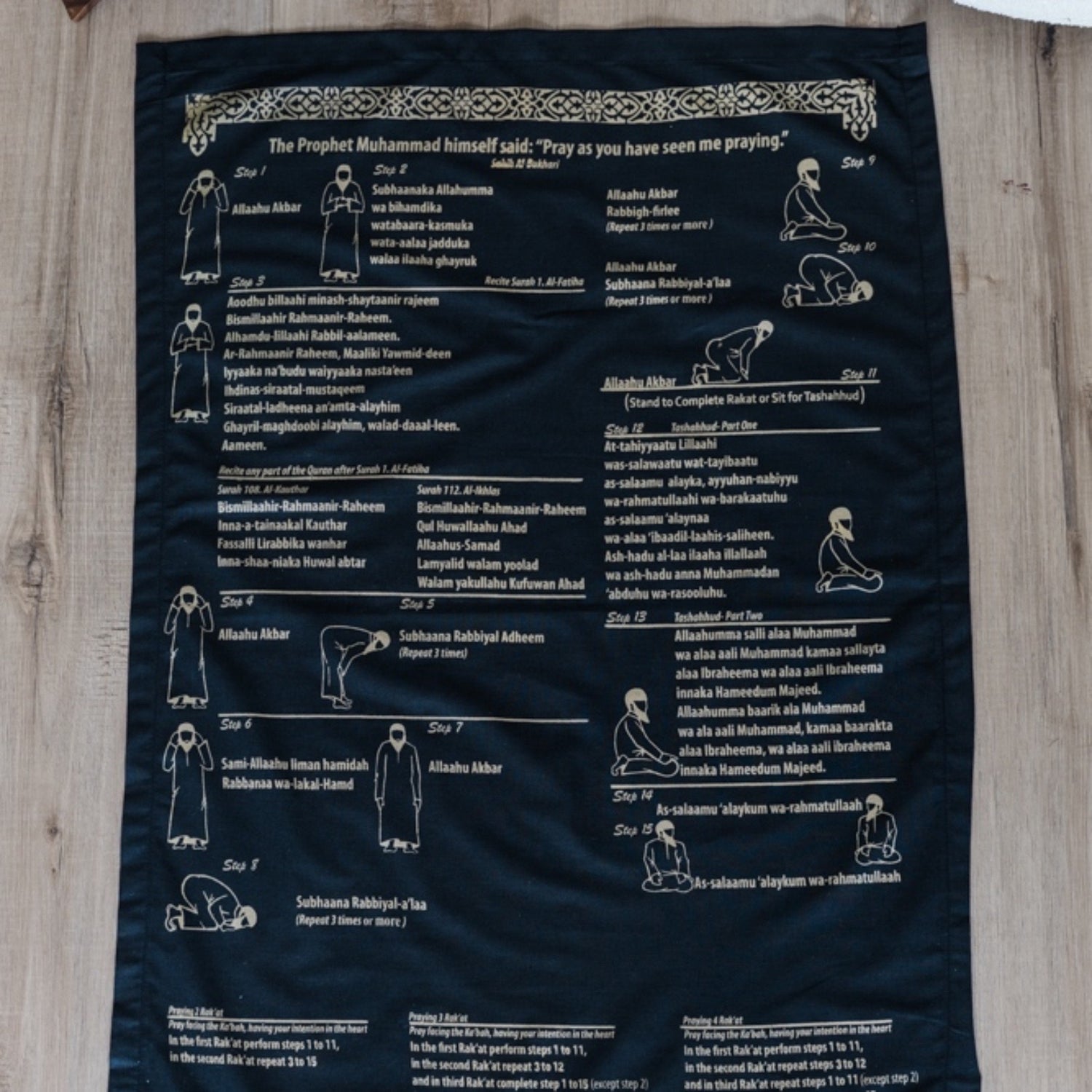 The mat features a step-by-step guide that takes you through each prayer stage, helping you understand and practice this fundamental aspect of faith with ease and confidence.