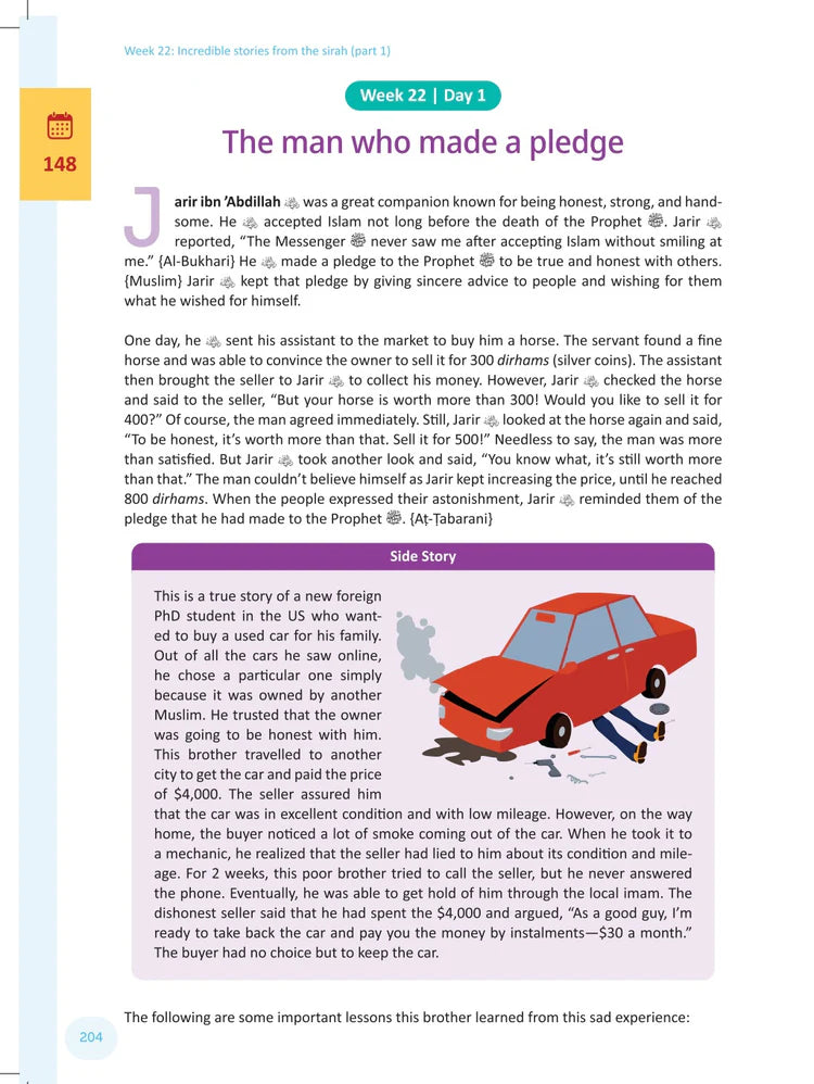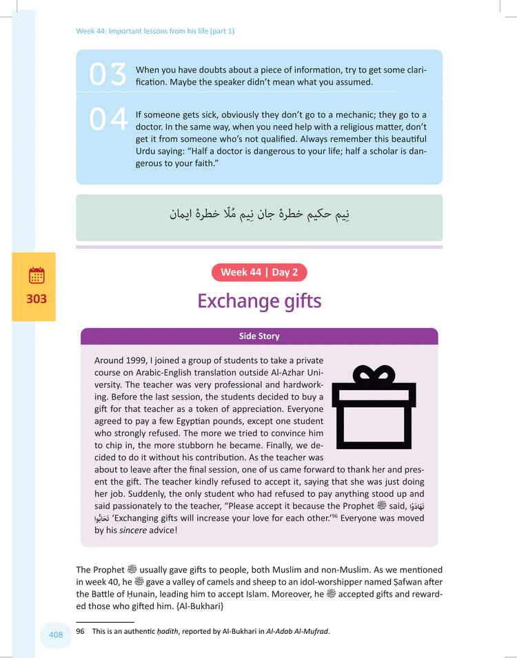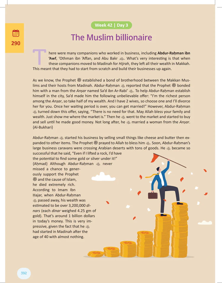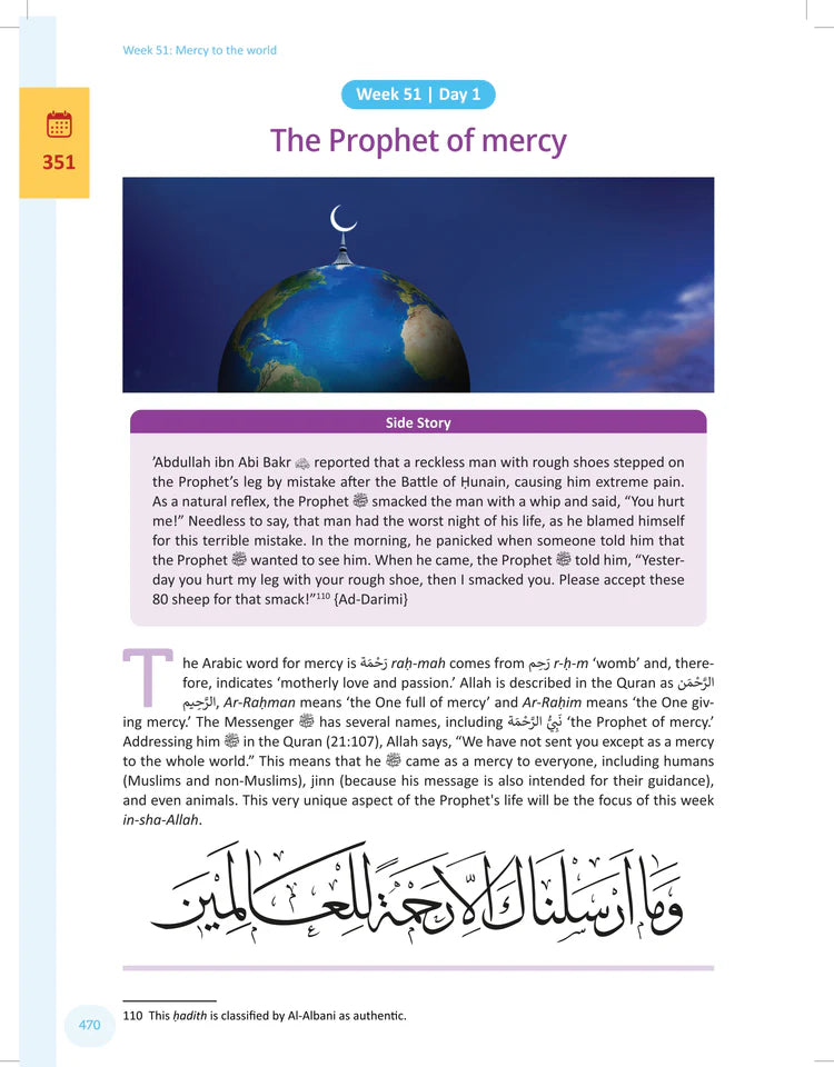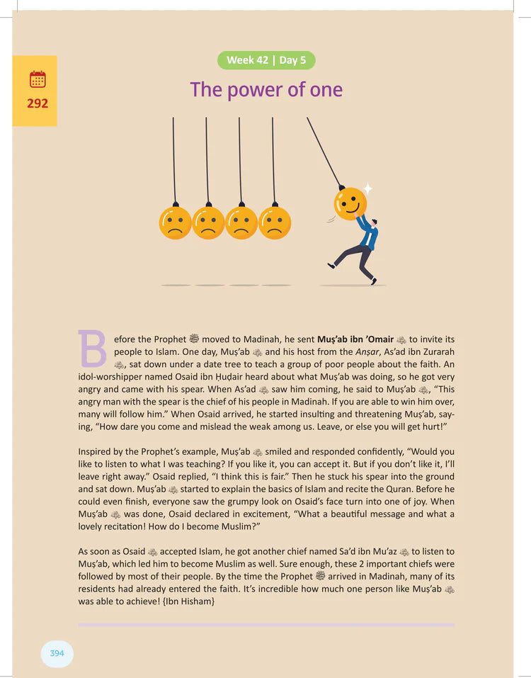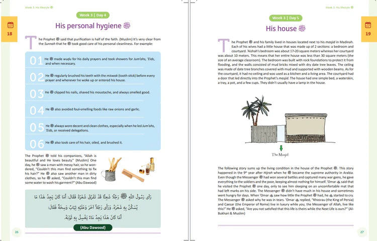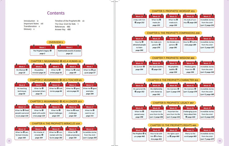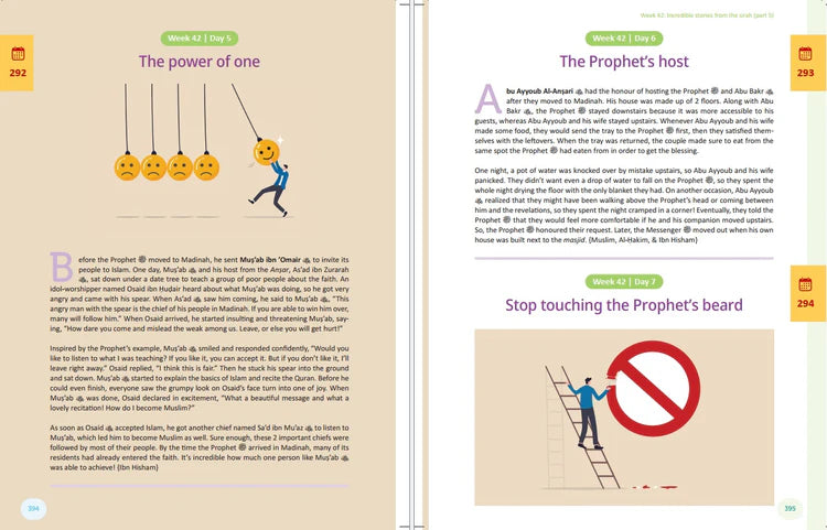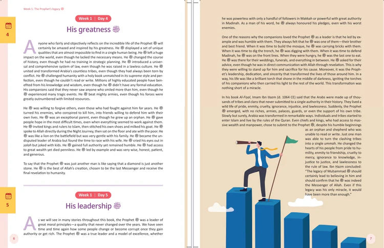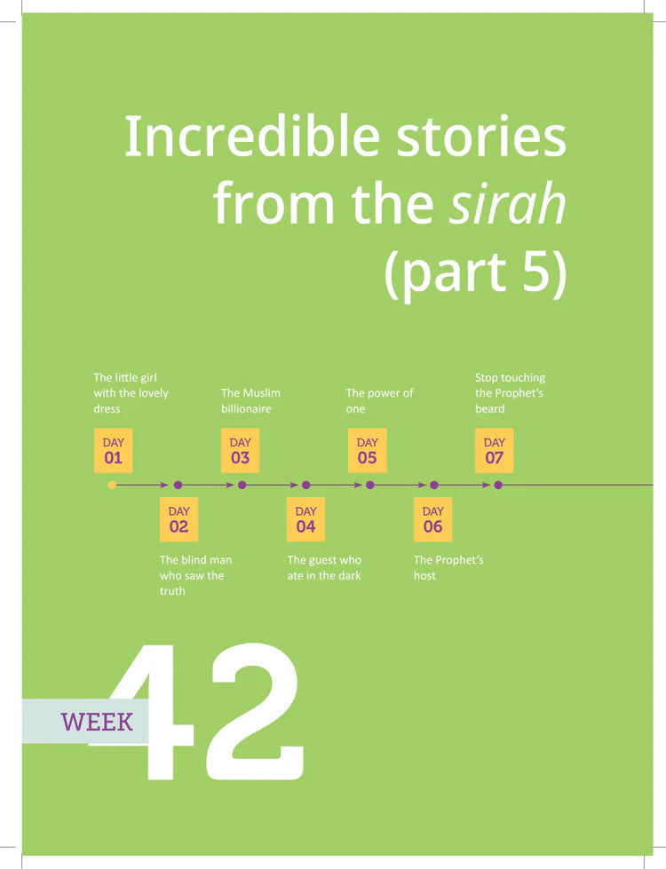 Each of the 52 weeks of the year covers a specific theme from the Prophet's sirah. These themes have been carefully selected to reflect the timeless excellence and superior wisdom of the Prophet ﷺ. Each theme is supported by amazing stories and examples, followed by a short quiz to ensure you have grasped the current theme.