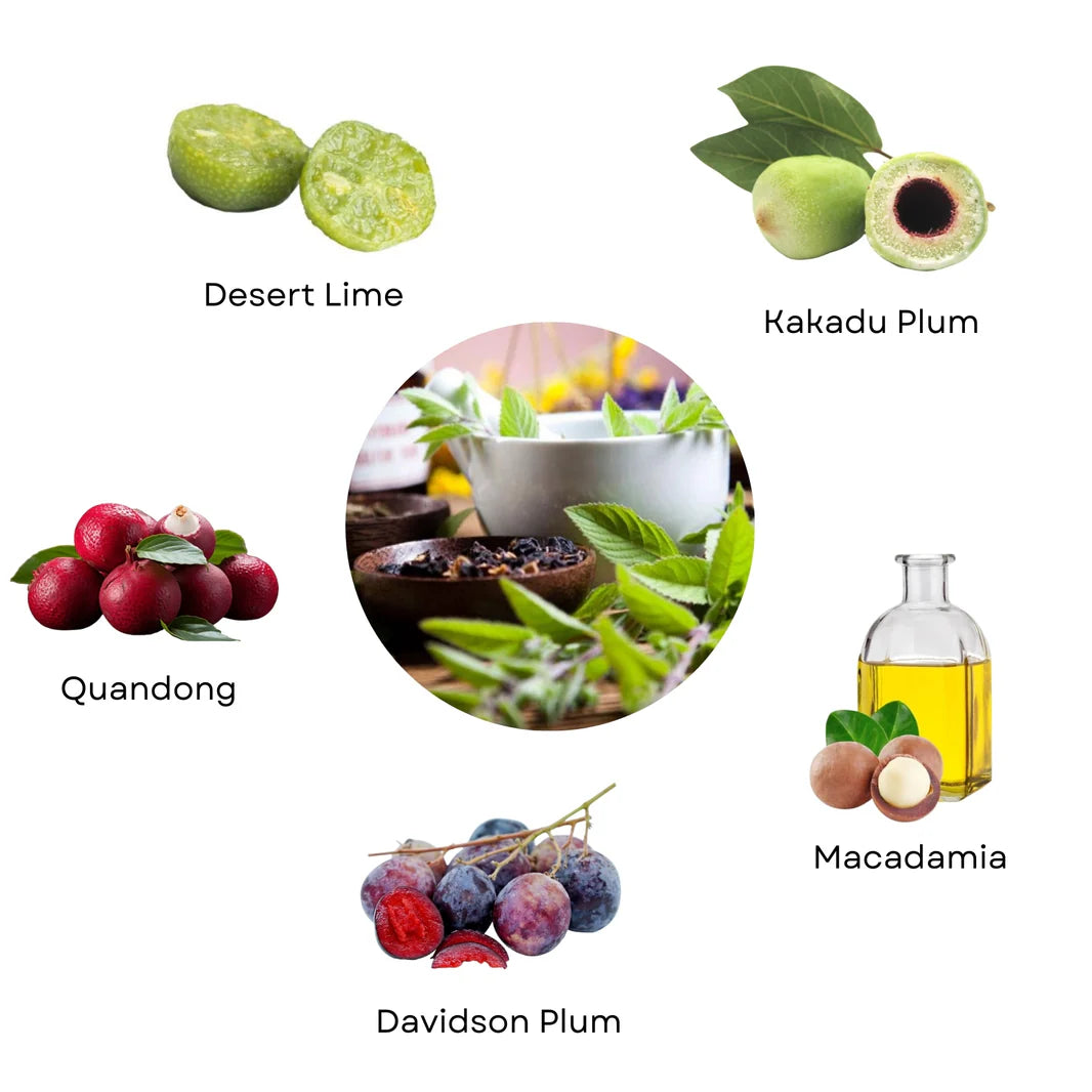 Leucadendron (Cajeput) Oil*, Simmondsia Chinensis (Jojoba) Seed Oil*, Persea Gratissima (Avocado) Oil*, Tocopherol (Natural Vitamin E), Syzygium Leuhmanii (Lilly Pilly) Fruit Extract*, Terminalia Ferdinandiana (Kakadu Plum) Fruit Extract*, Santalum Acuminatum