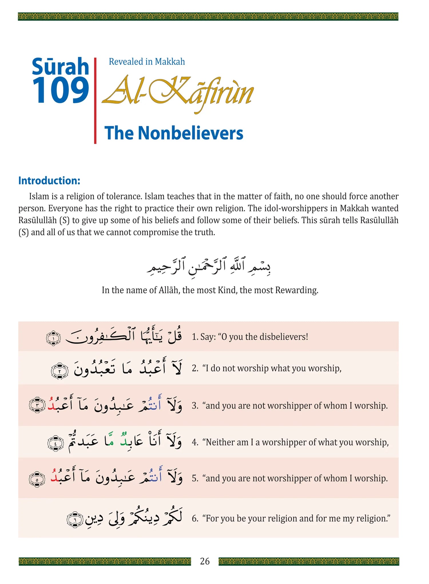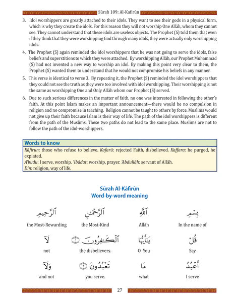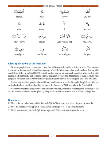 A “Words to Know” section provides root and derivatives of several key words used in the surah. This is further elaborated into a word-to-word meaning of the entire surah. Each chapter ends with some teachings in the surah that the children can apply in their everyday lives. A short question section reinforces the materials learned. Dsbook©.