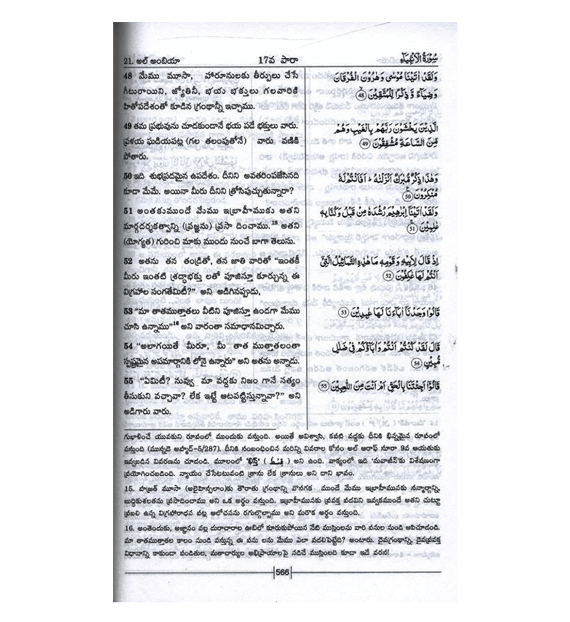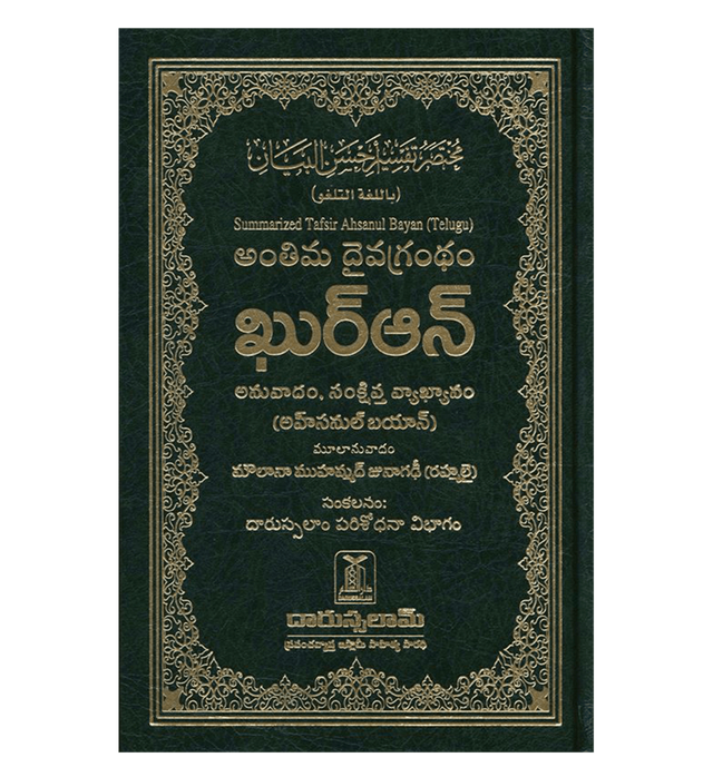 Full Telugu language translation of the Quran is featured on the left page in this Mushaf, and Arabic Indo Script is on the right. The Tafseer Ahsanul Bayan provides an easy-to-understand commentary of the Quran in Telugu.