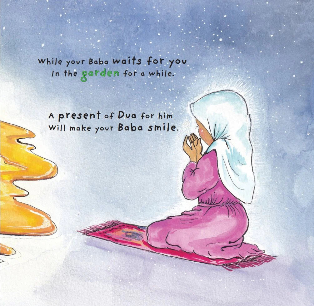A poem of hope dedicated to every Muslim child who has ever lost a parent, My Baba's House is a book to bring comfort to the children and adults of grieving families alike. Aimed at easing the struggle of loss, it takes readers on a gentle journey through Islamic teachings about the impermanence of death, the beauty of Heaven's eternity, and the hope of joyous reunions through lyrical descriptions, charming illustrations and simple, sincere reminders of the small acts of worship that strengthen the bonds of loved ones even through the temporary distance of death.