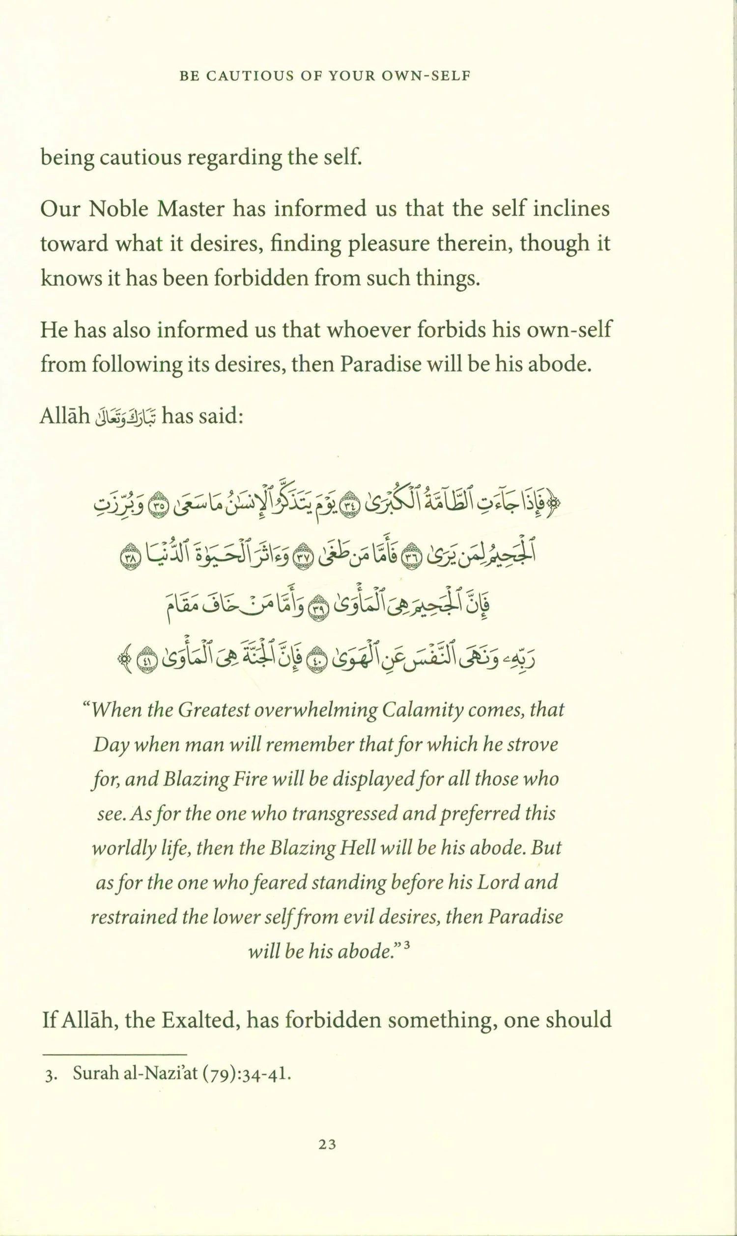 The author addresses issues related to the nafs in his usual style, drawing from the Qur’ān and the Sunnah. He warns the reader to be cautious of the lower self and to cleanse oneself of its impurities and the temptations of this fleeting world. This text will help readers recognise the pitfalls of carnal desires and challenge them to become pure and praiseworthy individuals. It is a vital resource that every soul needs in this modern age!